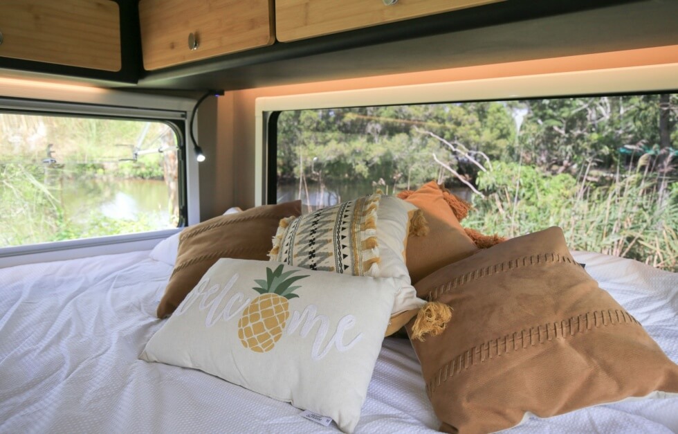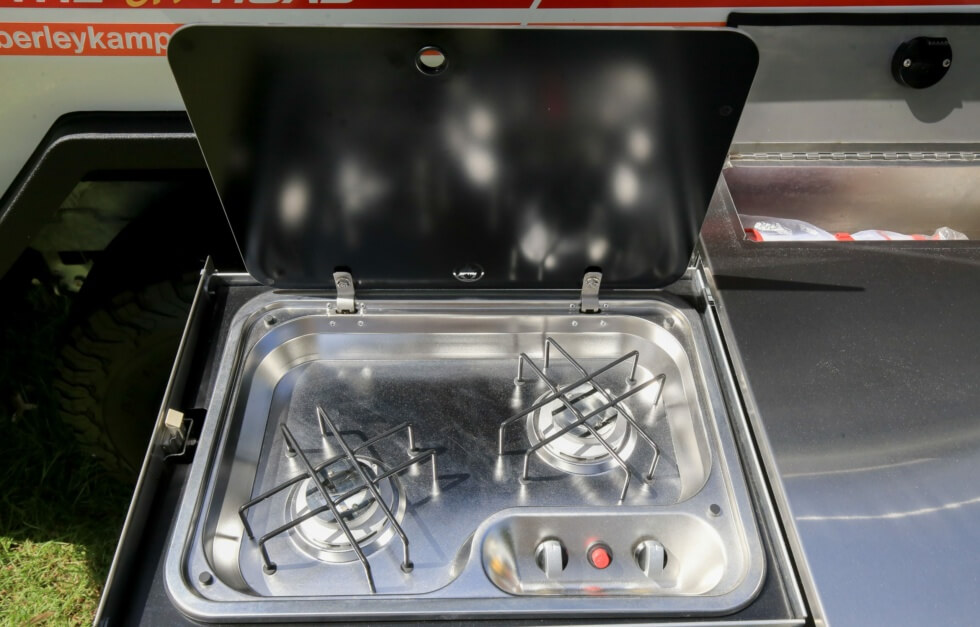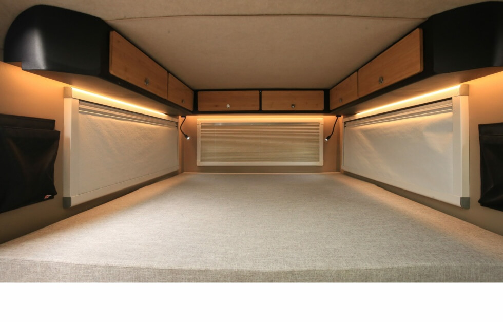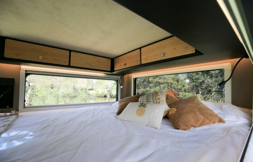 Merlin solar panels harvest clean energy to charge its Bluetooth-enabled lithium batteries. Its slide-out stainless-steel kitchen allows you to cook indoors or outdoors. The Kube can accommodate two adults comfortably with its king-size bed and provides great views with its panoramic windows.
