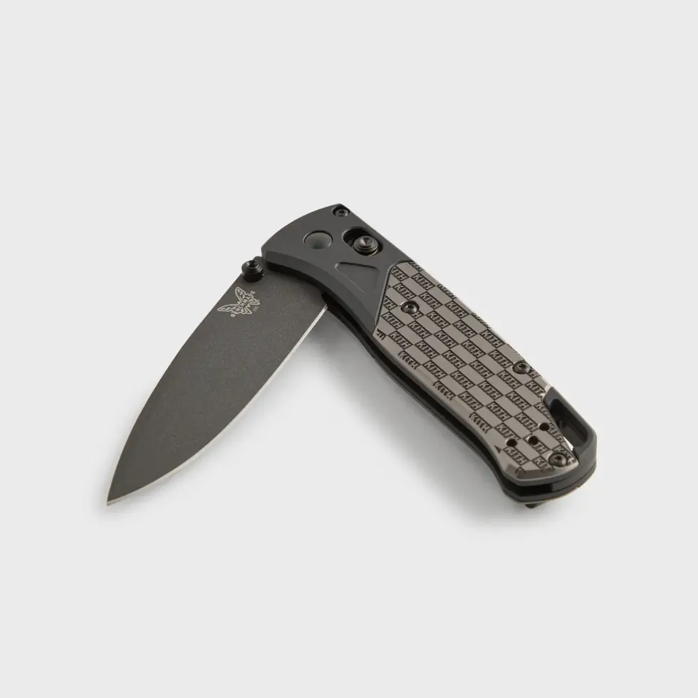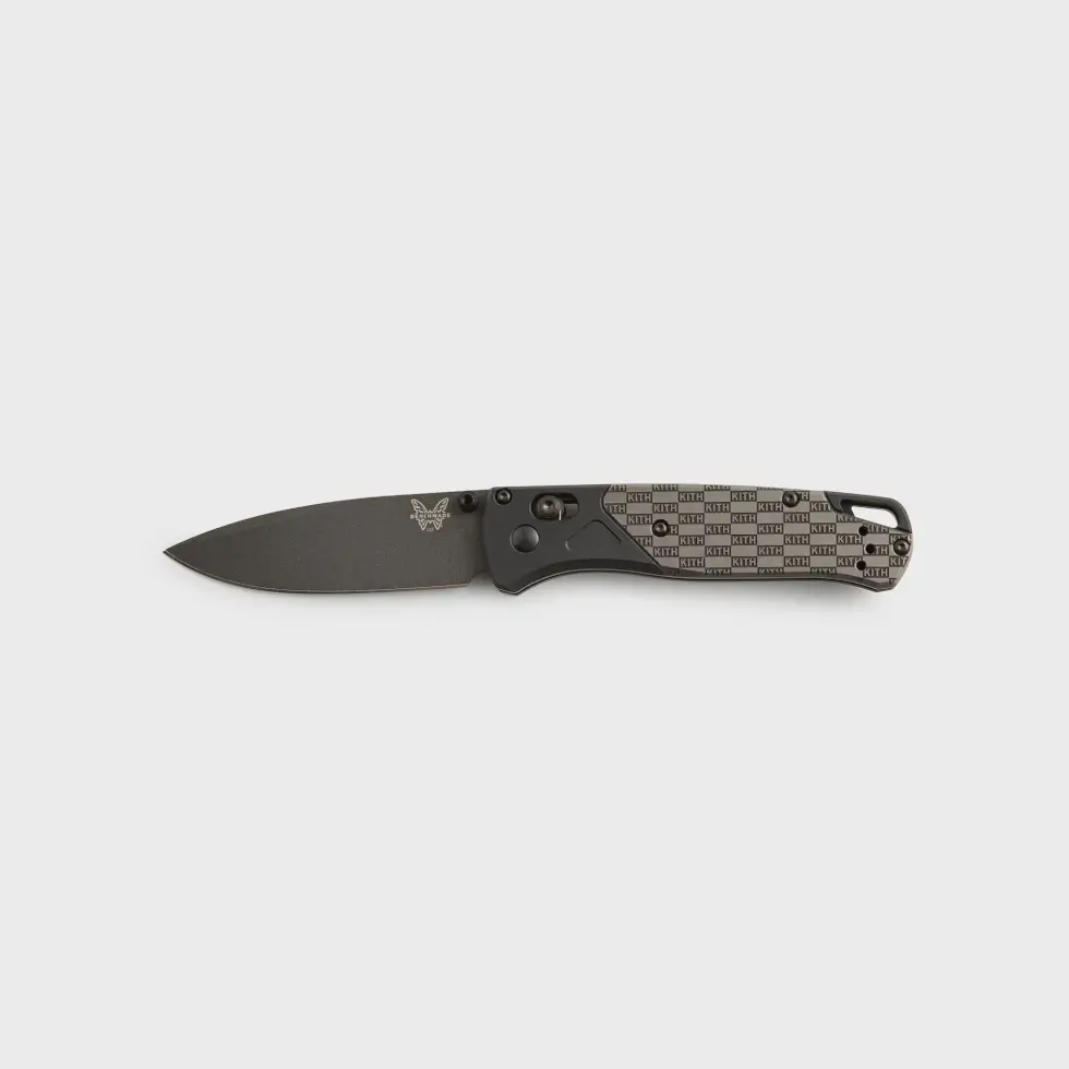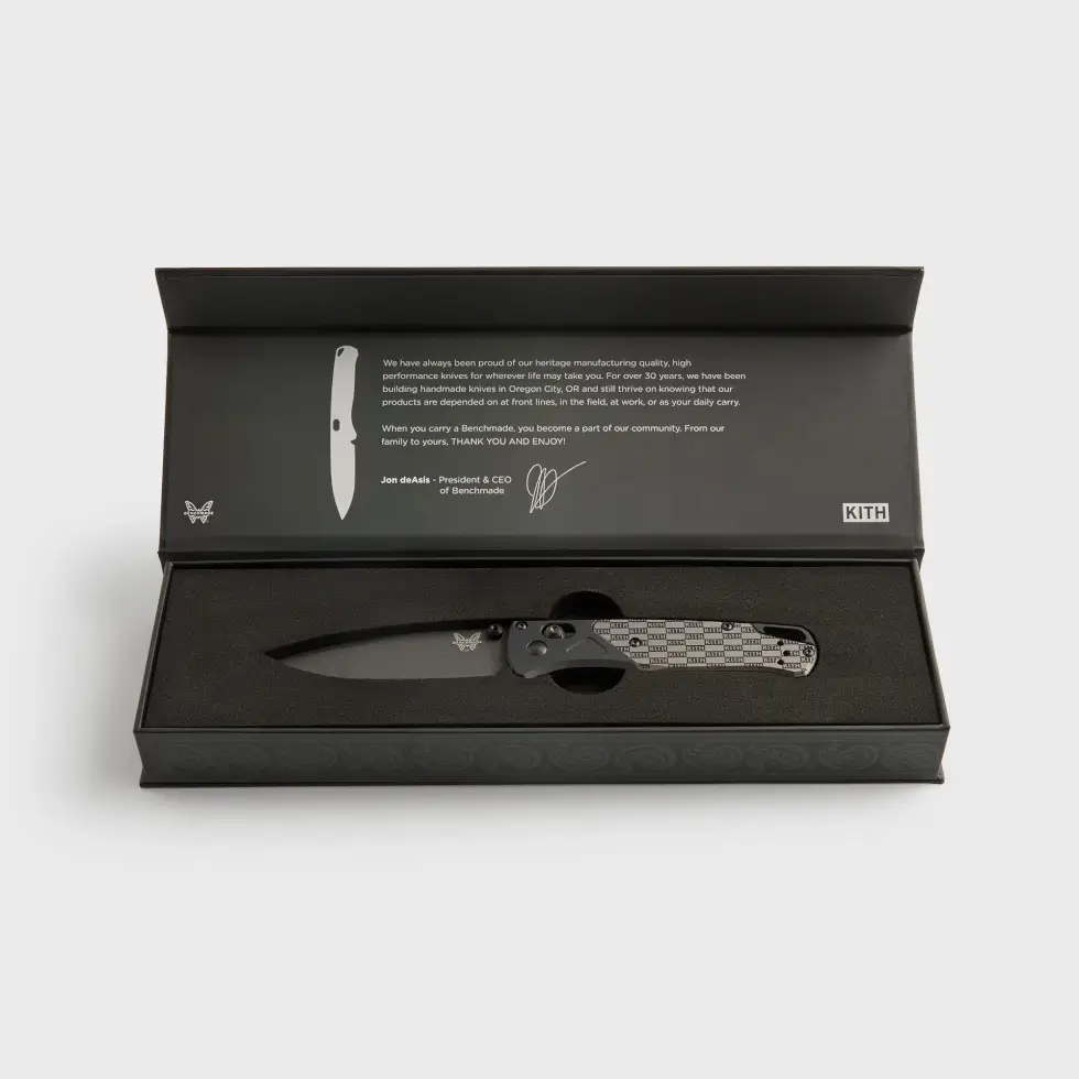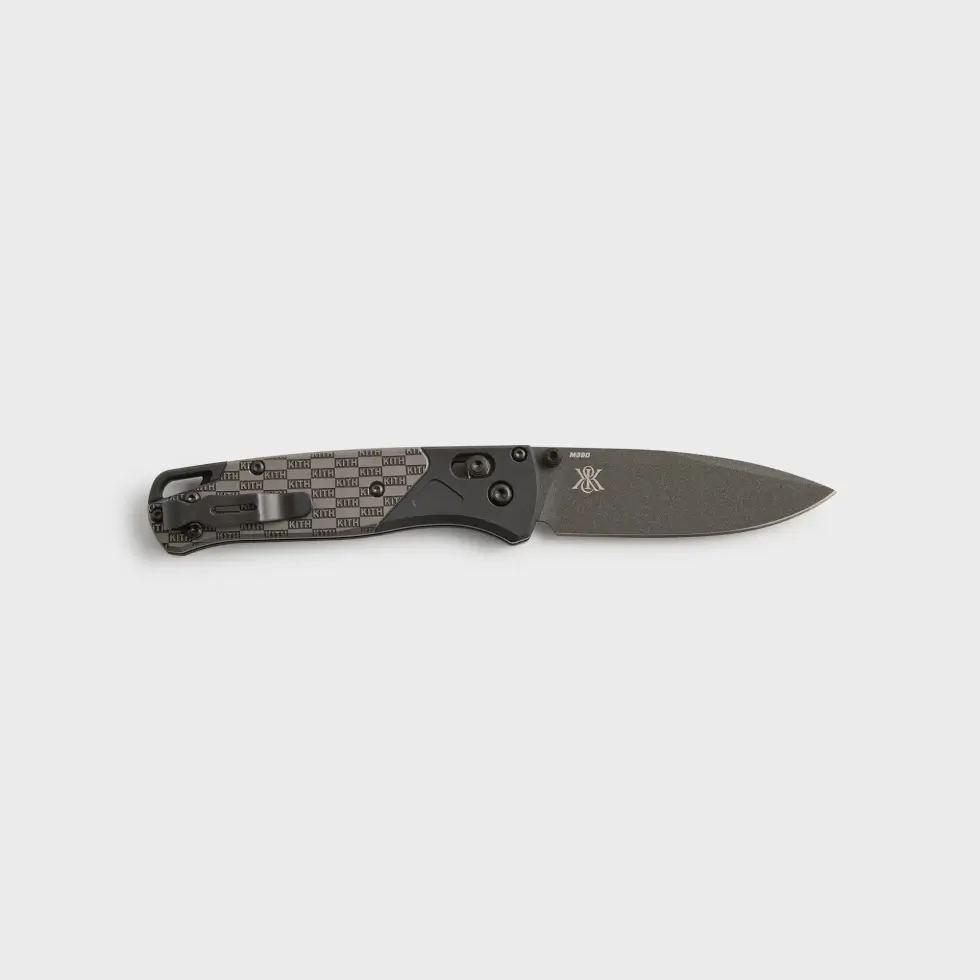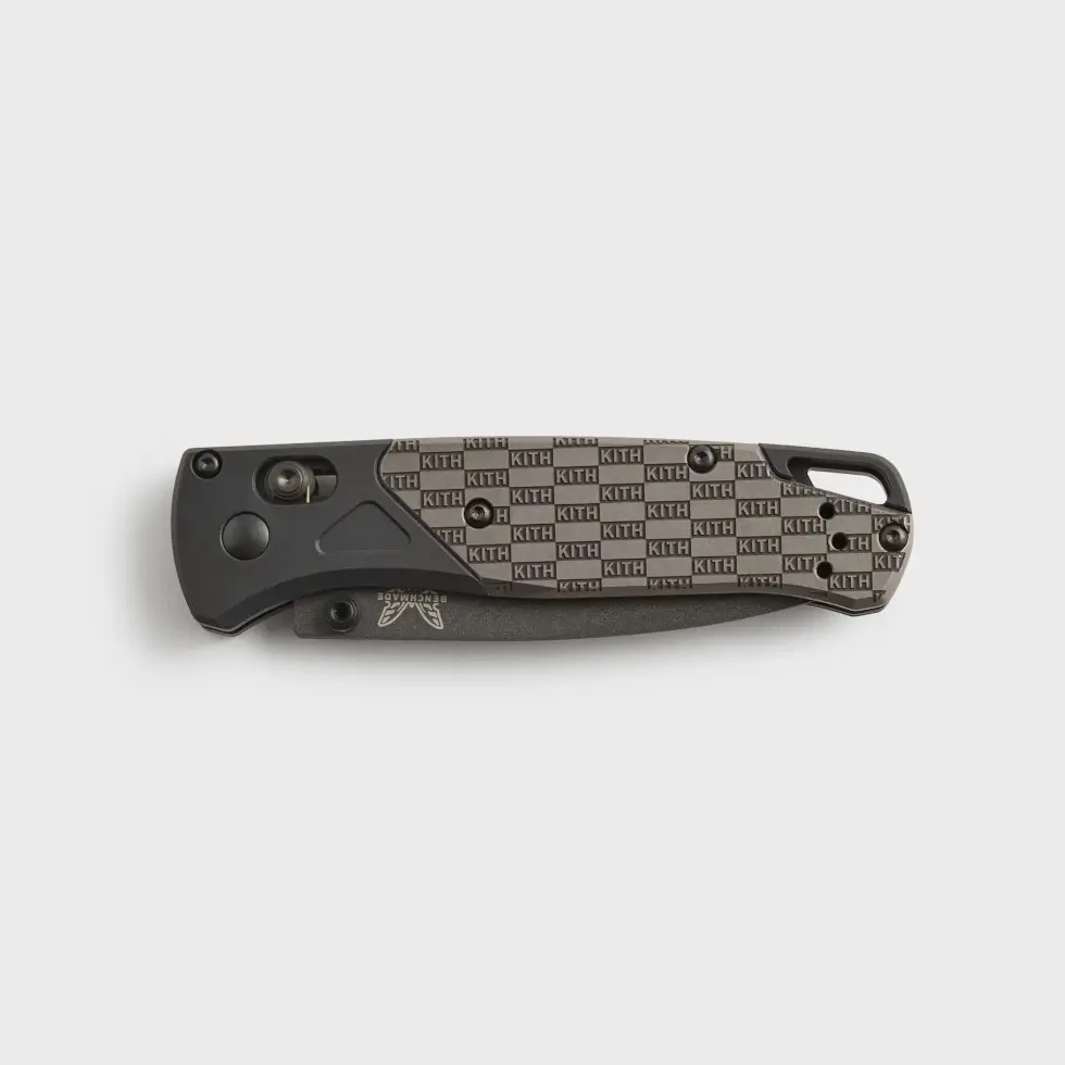 The design features subtle branding on the handle and blade. The handle features Kith’s checkerboard-like pattern logo, while one side of the blade has Kith’s Kith & Kin logo and the other is a Benchmade logo. But from a distance, you’d hardly notice these features and see a nearly blacked-out knife instead.