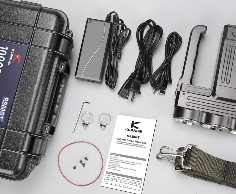 The Klarus RS80GT Flashlight is an upgrade of its predecessor, the RS80 with its higher lumens and bigger capacity battery pack, and fast recharging. It runs on six 3400mAh Li-ion batteries that can support 135 hours of runtime. A DC charging table gets it to a full charge in three hours. Likewise, it recharges via a USB-C cable that makes it easy to use the batteries as a portable power bank.