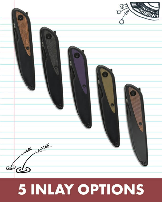 The Doodler is available in three different G10 scale colors and in five different inlay options. Two tiny screws that hold the inlays in place also enable easy swaps. Knafs made the inlays open source, allowing users to design and 3D print their own styles.