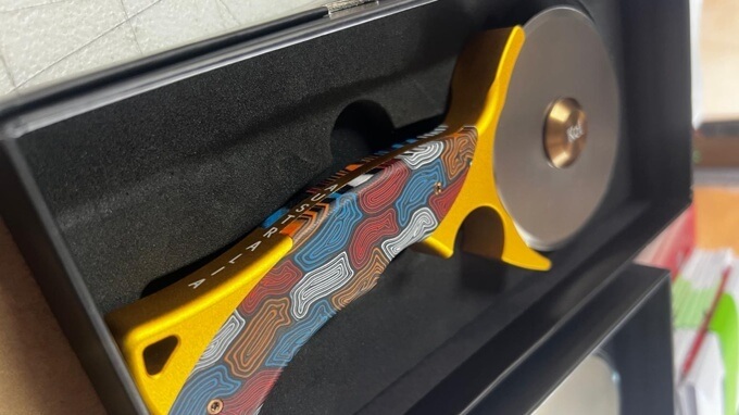 Meanwhile, the handle isn’t merely purely for aesthetics or gimmick. Instead of plastic or polyurethane, it’s a layered G10 handle. G10 is a fiberglass composite known for its balance of lightweight strength and resilience. The gold section in the handle is aluminum.