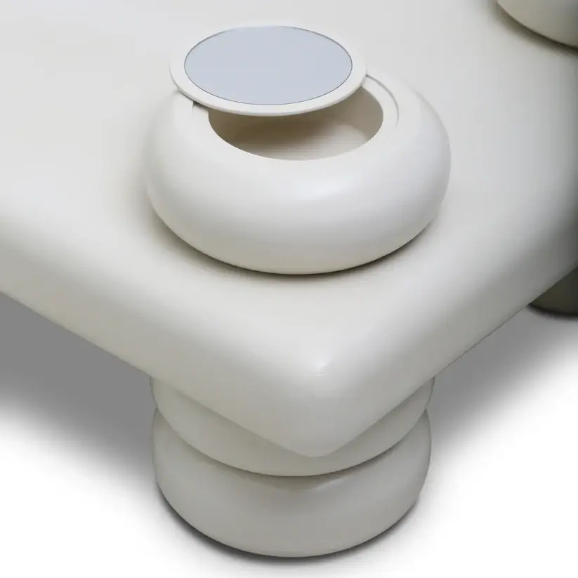 It effortlessly integrates these said “party” containers into the table’s design. Three of the cylindrical shapes mounted on the surface of the table that mimics the legs have lids on them for a purpose. One on the corner comes with a perforated sheet of metal and serves as a pewter ash tray.
