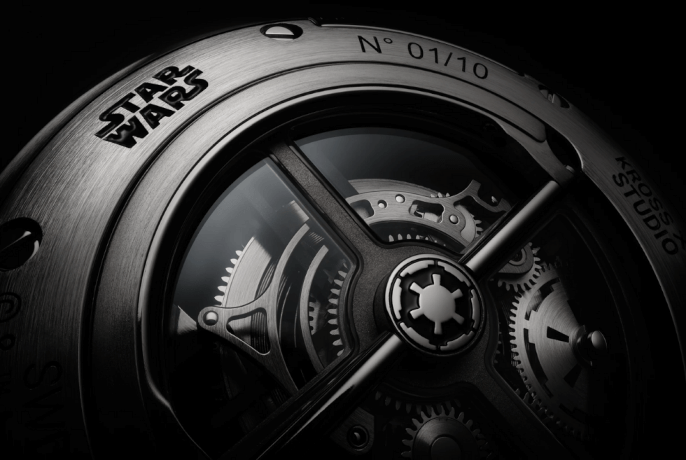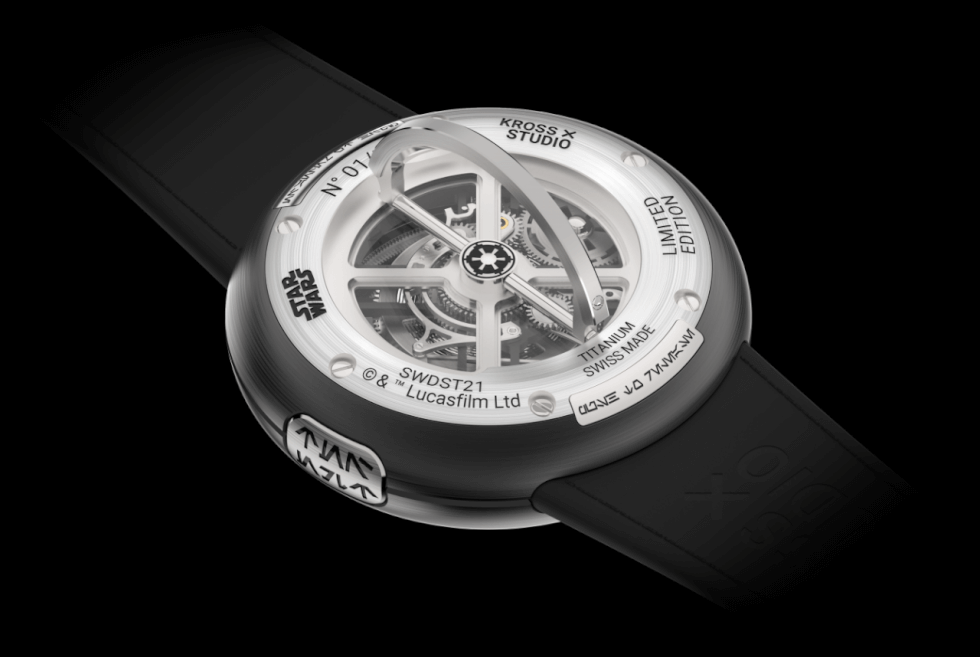 Kross Studio gives it a 5-day power reserve via the MKS7000 manual-winding calibre. It even uses a unique D-ring crown system which is located on the caseback with four sapphire crystals. A single push button on the right of the caseband features an engraving in Aurebesh script.