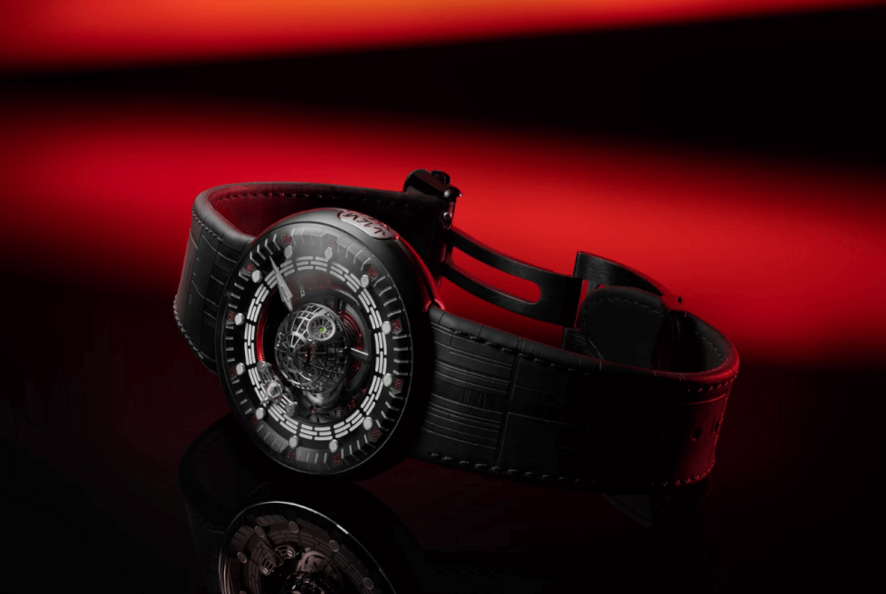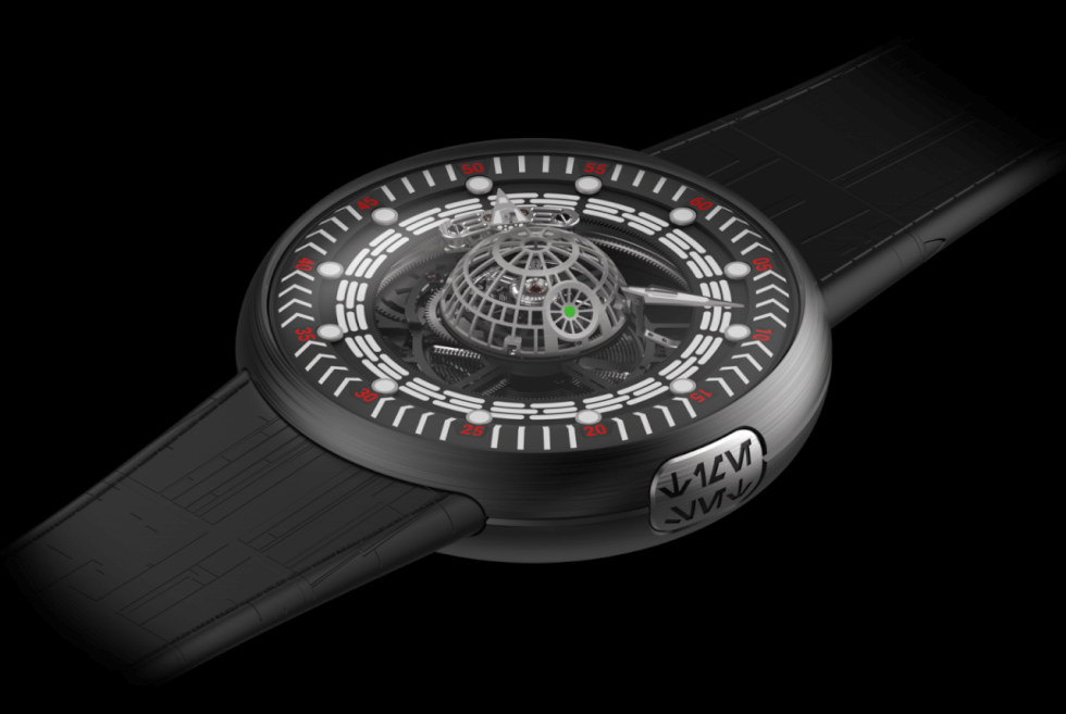 The prized item in the Death Star Ultimate Collector Set is the Death Star Tourbillon. It features a 45 mm x 12.55 mm grade-5 titanium in black DLC. The overall thickness of the watch is 20 mm If you include the sapphire crystal dome.