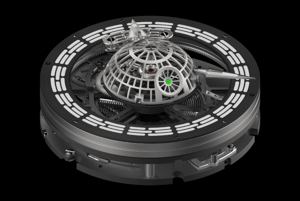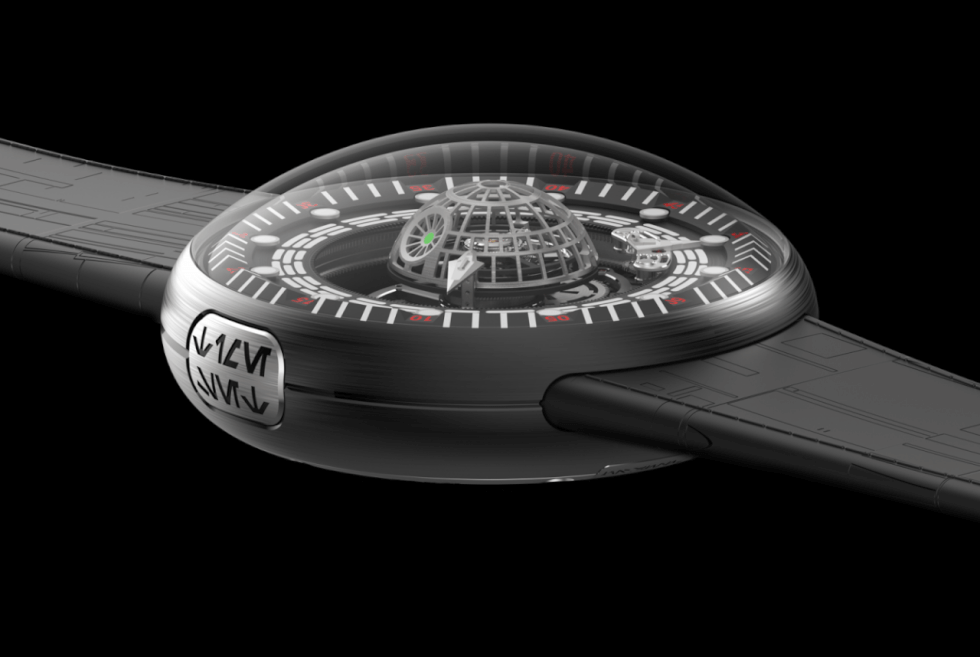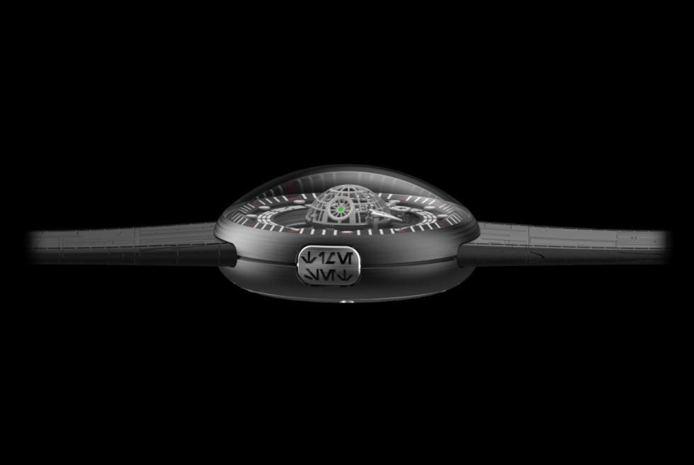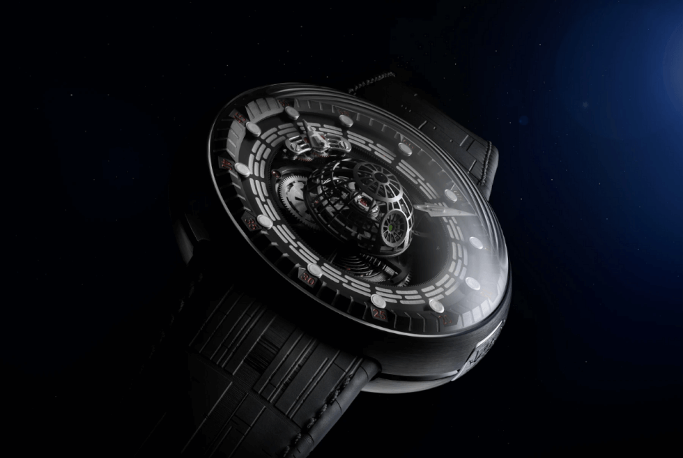 its premium mechanical complication sits just below a cage designed to look like its namesake. An Imperial-Class Star Destroyer points to the hour, while the Super-Class Star Destroyer tells the minutes. Lastly, the green superlaser cannon powered by Kyber crystals stands in for the seconds.