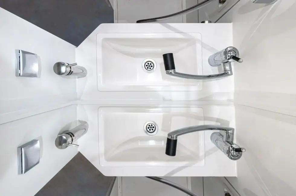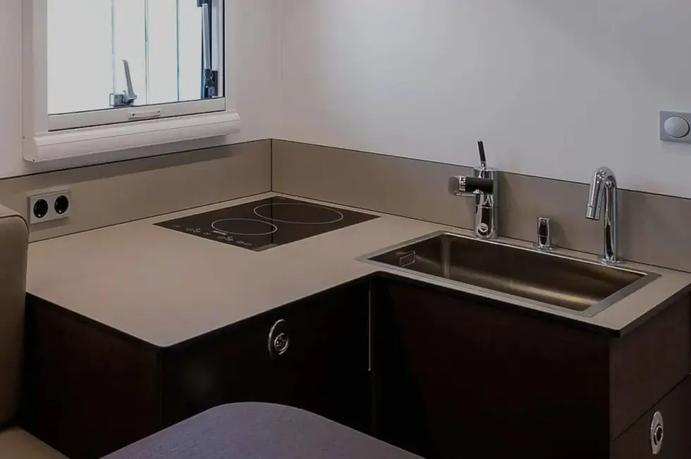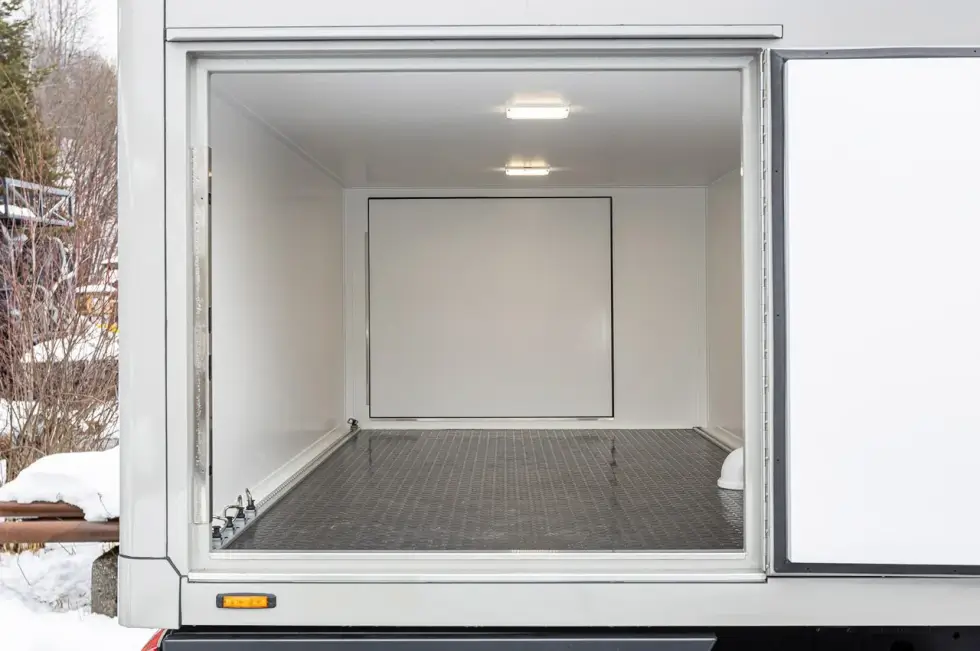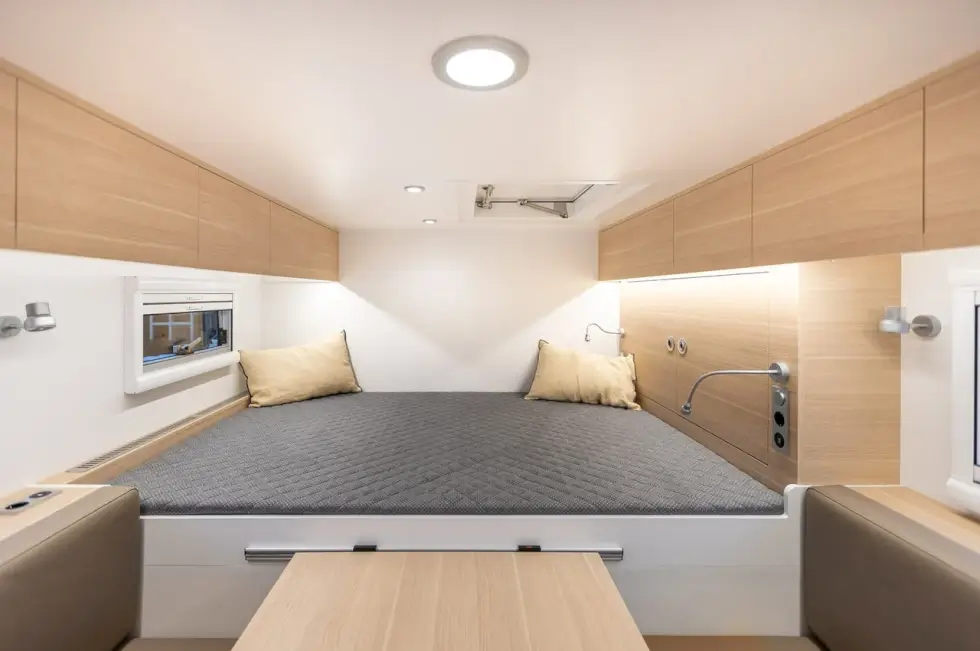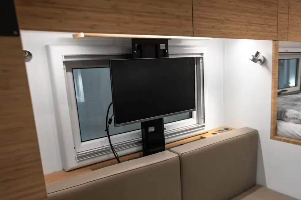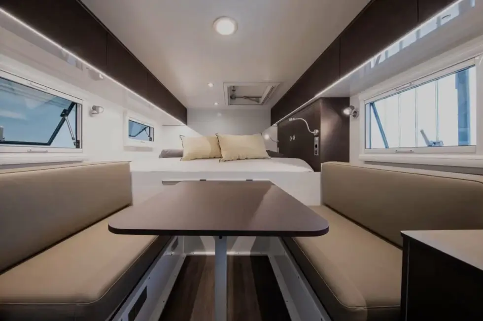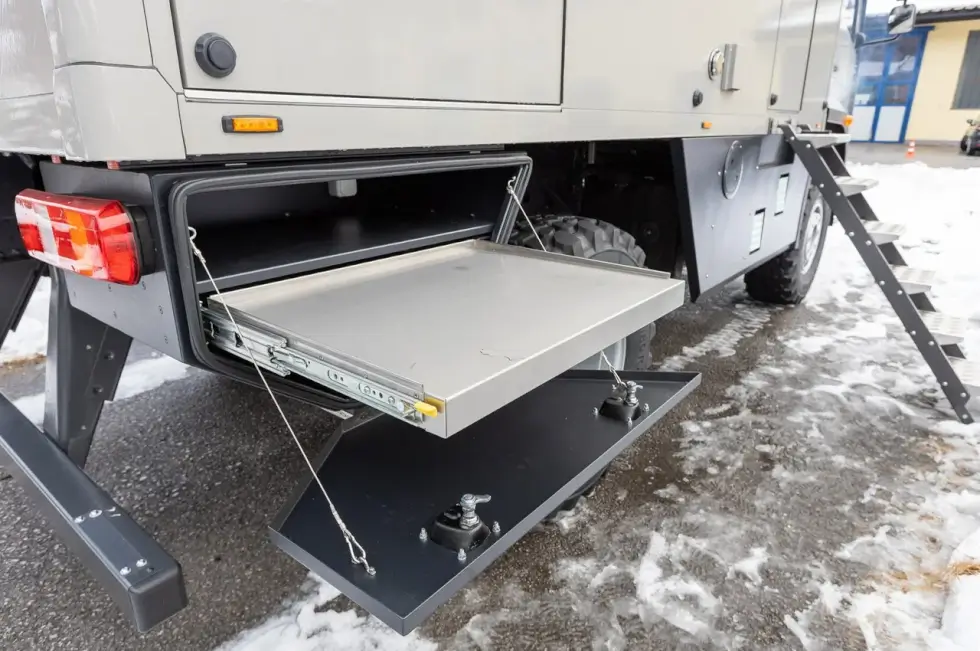 You can climb up to the entrance door via quick access steps or the optional slide-out stairs. The module’s volume holds a fridge, wardrobe, an L-shaped kitchen, a dinette with a sliding table, and a spacious sleeping area. The Project Rhino even comes with a bathroom complete with a toilet and shower. The wall holds an access door for the passthrough to the driver’s cab.