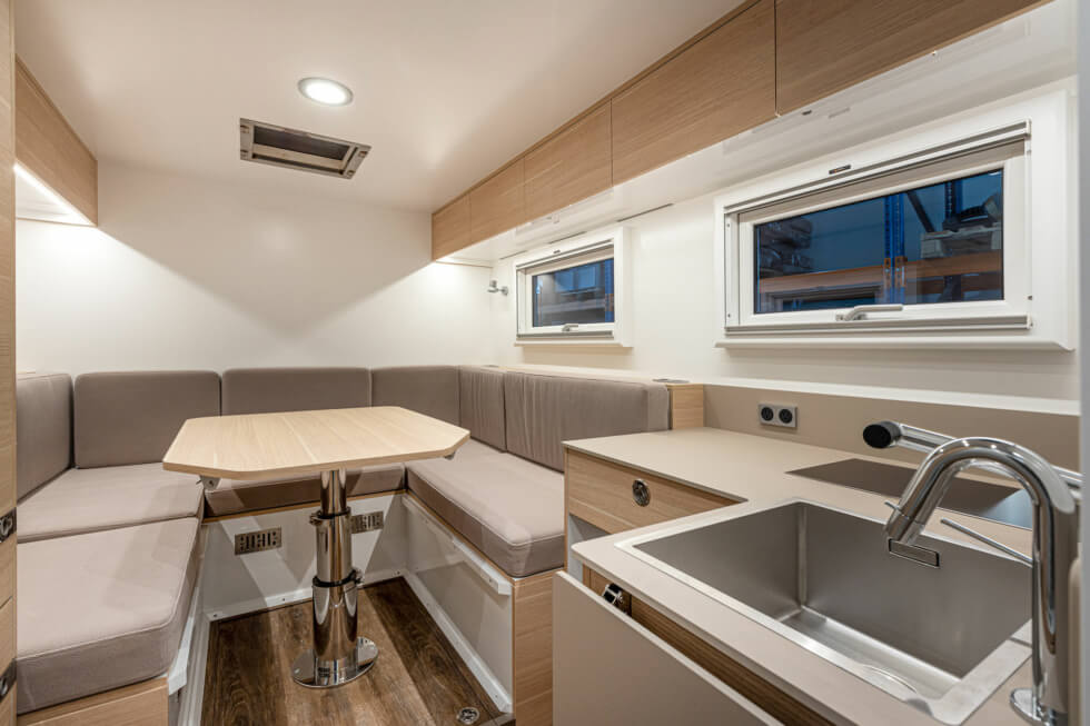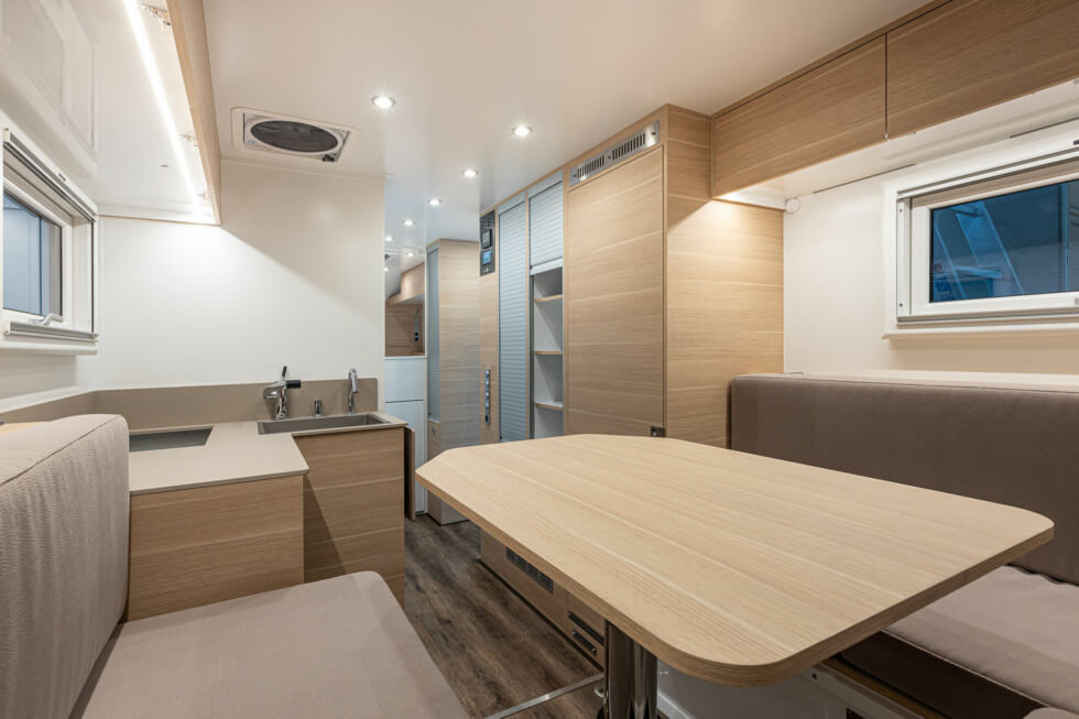 Sliding insect screens keep the creepy crawlies out when you want some fresh air. Wooden furniture adds some warmth to the volumes within, while leather or fabric upholstery provides texture to the seats. The Bedrock XT2 dining area features a table, which can be converted into a sleeping area.