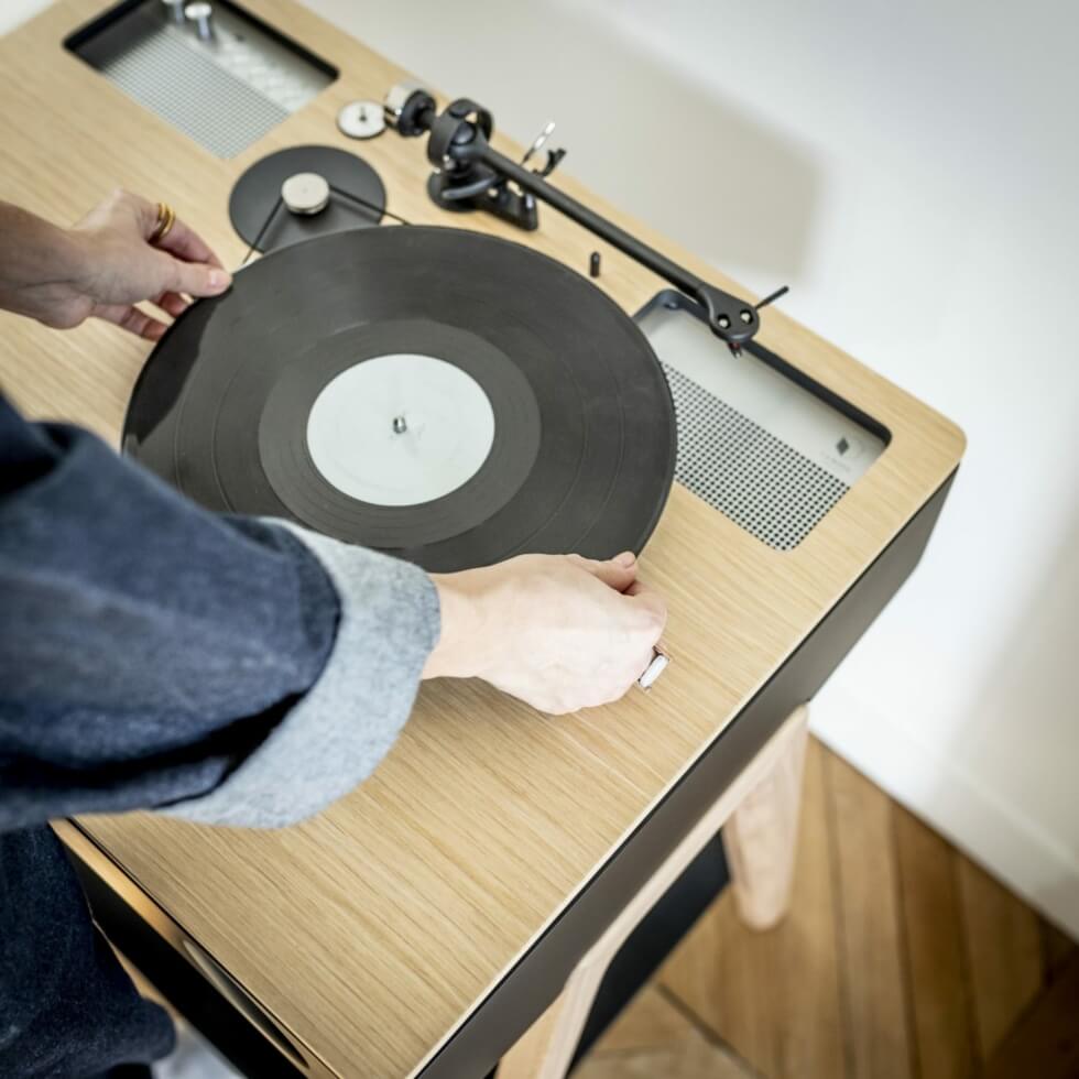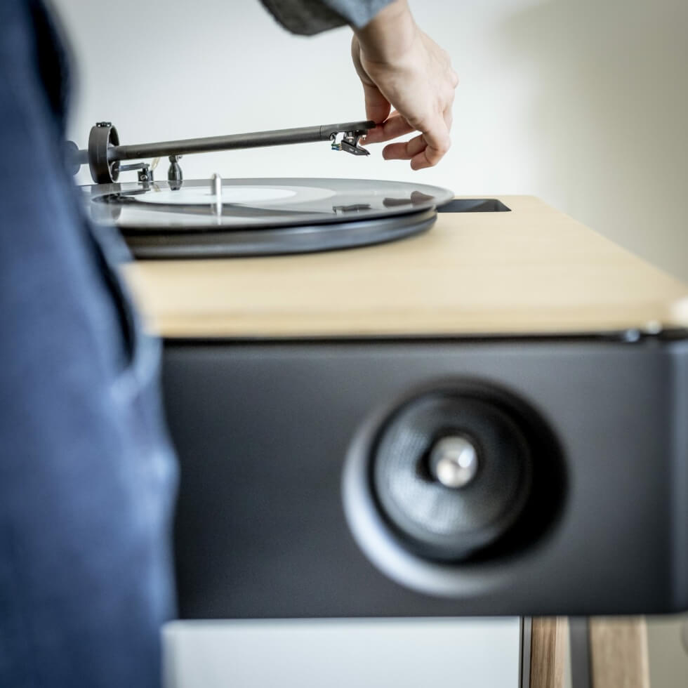Moreover, this turntable is not just about function but also form. It boasts an elegant and minimalist design devoid of any visible cables or chassis. The aesthetics give the impression of a floating vinyl on the speaker panel. Underneath is a dedicated space to store your favorite records.