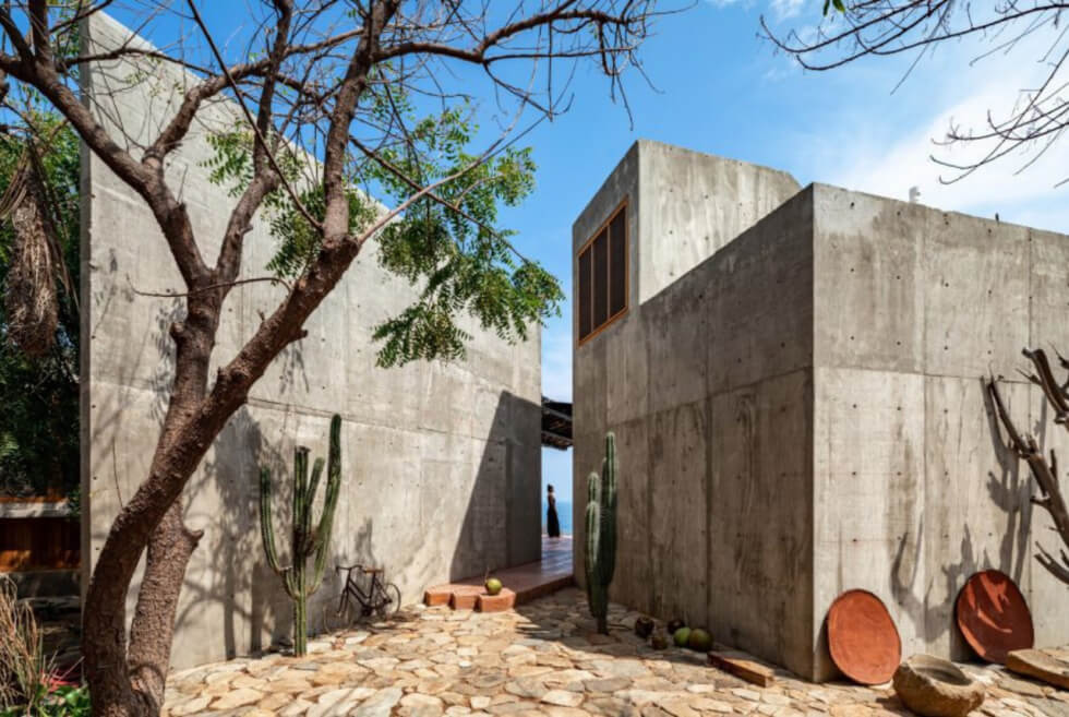 This minimalist “casa” or home consists of two rotated concrete volumes that look to the sunrise and sunset, respectively. Located on Zapotengo coast in Oaxaca, Mexico, it provides sweeping views of Zapotengo beach through large square openings. It offers a tranquil setting through the use of a muted palette of greys and terracotta bricks mixed with light timber tones.