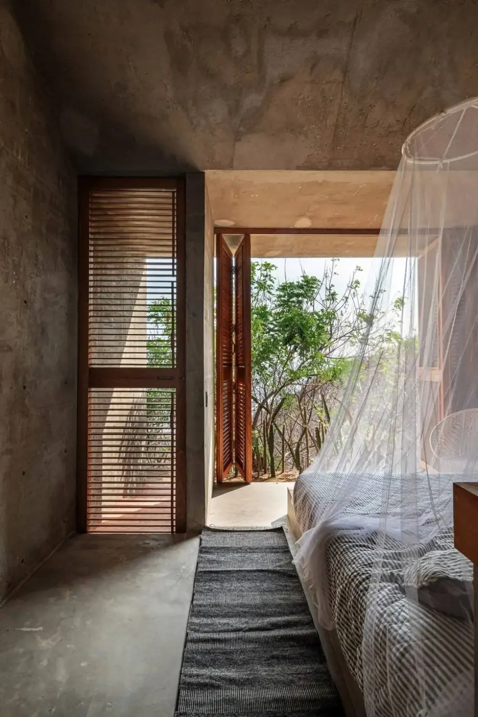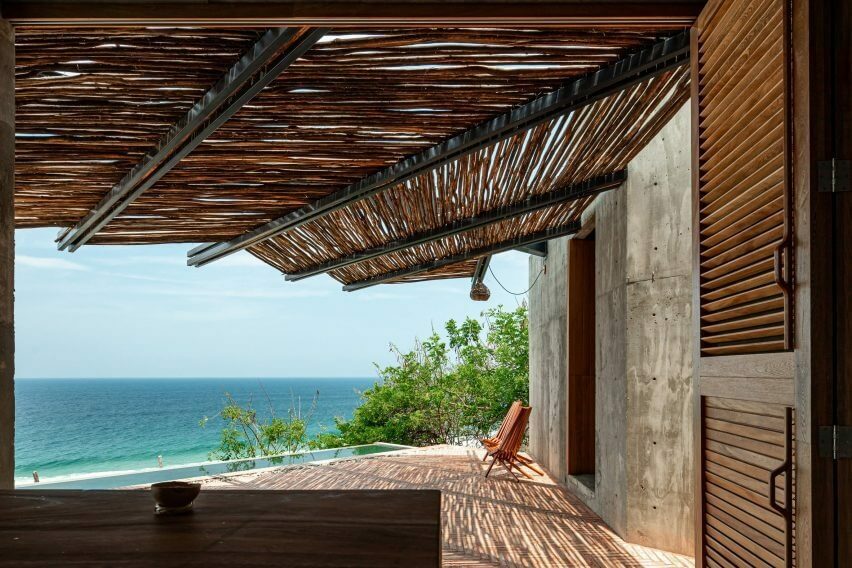 Moreover, the strategic positioning of the volumes in this casa gives space to a triangular courtyard that houses a long rectangular pool. The pool offers unobstructed views of the sea. A suspended concrete staircase also leads to an open rooftop. Meanwhile, cacti and trees adorn the rugged stoned paving that surrounds the property.