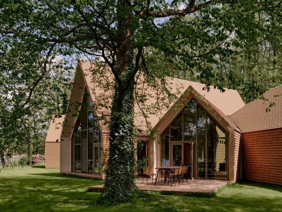 Wood is a material people typically think of as rustic, but remarkably versatile in the hands of an experienced professional. Depending on the viewing angle, one might assume these are a collection of A-frame buildings. However, despite the steep angles of the gable roof, the edges are a considerable distance from the foundation.