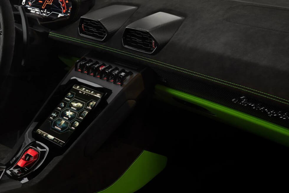 Matching the beauty of its silhouette, the cockpit is replete with top-shelf refinements one can expect from Lamborghini. Plush Alcantara upholstery wraps the dash, seats, center console, and more. Impressive connectivity options make the Huracán Tecnica’s infotainment system compatible with Apple Car Play, Android Auto, and Amazon Alexa.