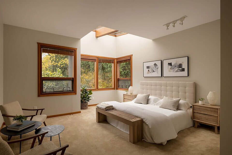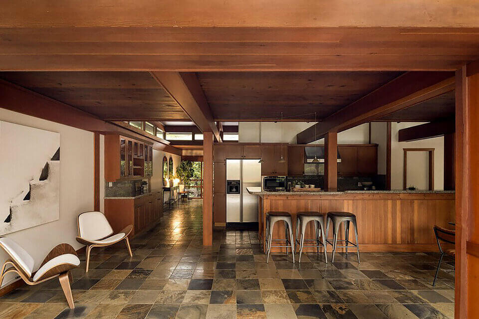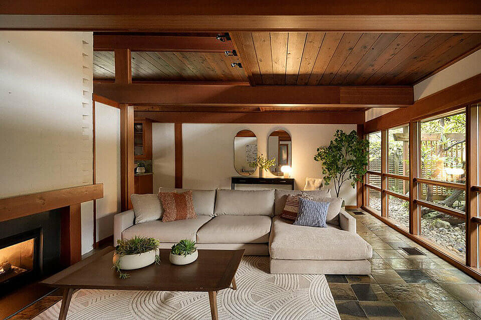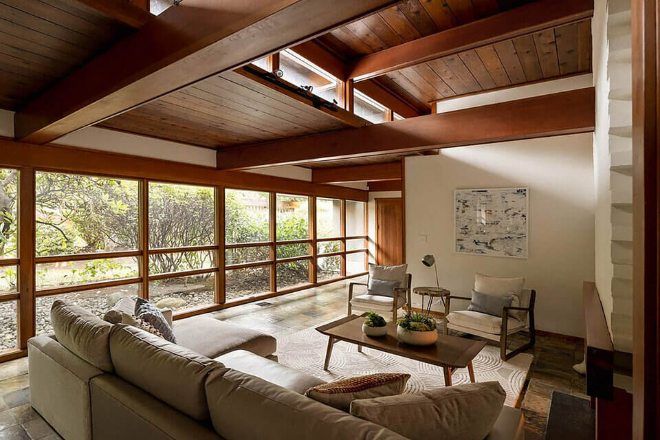 The two-story mid-century modern property hosts five beds and 3.5 baths and has a basement. Russell Hollingsworth expanded and renovated the home according to its Neoteric heritage. in 2020. Fred Thornton Hollingsworth coined his most basic residential properties “Neoteric,” defined by its use of fir and cedar, which began with the formulaic post-and-beam design customizable for each family. These houses were designed to fit on any lot in any direction.