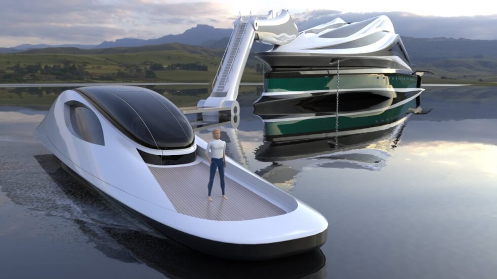 What looks like the head is actually something extraordinary. You see, when the superyacht is in motion, it can fold down to improve its aerodynamics. Furthermore, then neck can even lower the aforementioned section onto the water below. This turns it into an auxiliary 52-foot tender, while the top end of the tower becomes the main control tower.