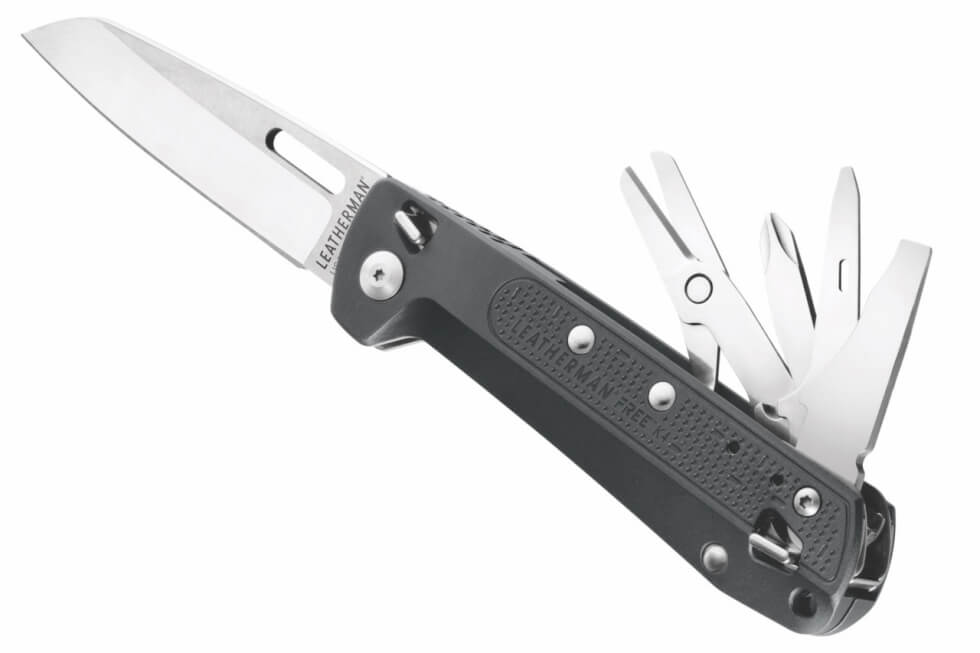 The LEATHERMAN FREE K4X multi-tool knife boasts nine tools that cater to any home and outdoor repairs.  It has a bottle and package opener, a pry tool, an awl, a Phillips screwdriver and a medium and extra small screwdriver. This tool is also equipped with spring-action scissors for added functionality.
