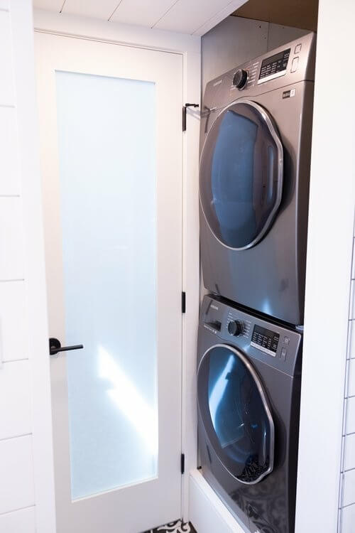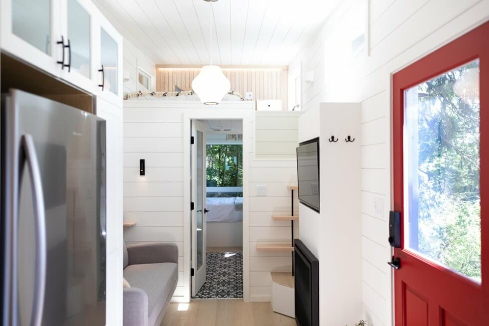 Another door opens to a bathroom with a sink, a shower, a toilet, and a stacked washing machine/dryer. Next is a sliding door leading to the main bedroom. Left Coast Tiny Homes Optimizes the Arrowsmith to even accommodate a loft bedroom accessible via a wall-mounted ladder.