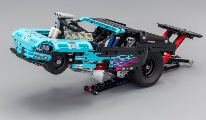 The massive V8 engine is a true work of LEGO art, complete with moving pistons and connected to a working steering wheel. You can actually raise the body nine inches high to get a look at the chassis, functional transmission, and exhaust pipes. It even can be upgrade to pop wheelies, or rebuilt into a “Supercharged Dragster”.