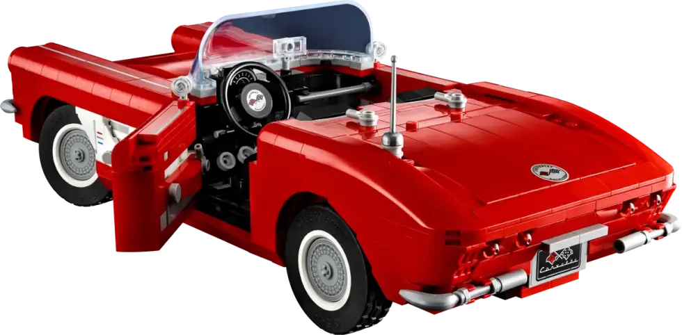 Once completed, the Chevrolet Corvette 1961 measures 12.5” x 5.5” x 4” (L x W x H) and features articulating sections. LEGO’s mechanical design allows you to open the doors, open the hood, steer the front wheels, spin the radiator fan, and remove the top to convert the coupe into a cabriolet. Finally, three sets of license plates are included in the package.