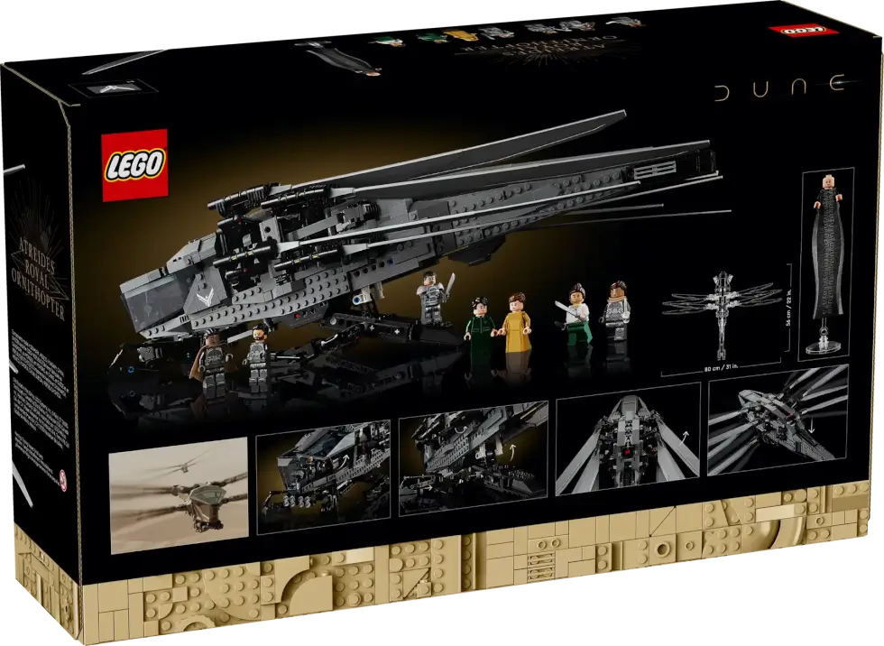 LEGO also writes: “The set also includes 8 iconic characters from the movie: Paul Atreides, Lady Jessica, Gurney Halleck, Chani, Leto Atreides, Liet Kynes, Duncan Idaho and Baron Harkonnen in his long robe.” Since the Atreides Royal Ornithopter is stable enough on flat surfaces, a buildable stand is not included in the box.