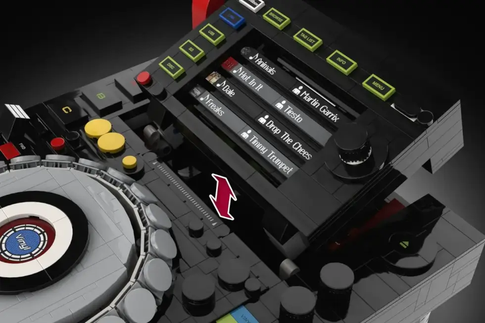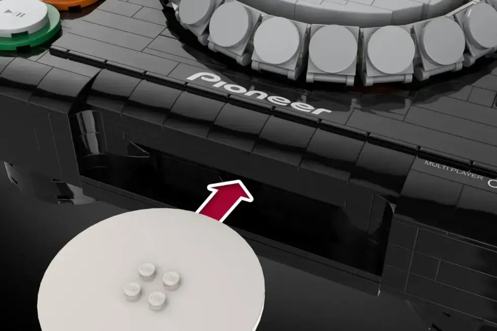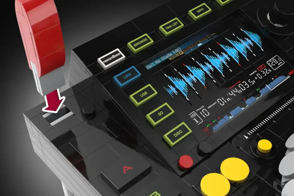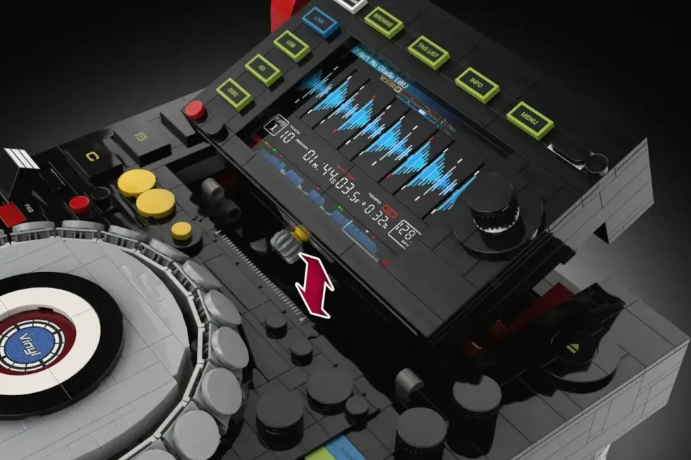 Details include an adjustable tempo fader, a USB stick and port on the upper left corner, a cd loading slot, an eject button, knobs, and a jogwheel. To make it even more immersive, the LEGO Pioneer CDJ 2000 Nexus features two replaceable LED panels. The waveform display works in conjunction with the jogwheel.