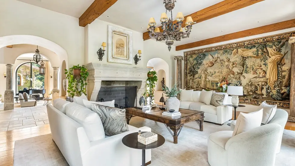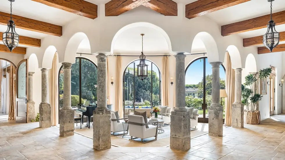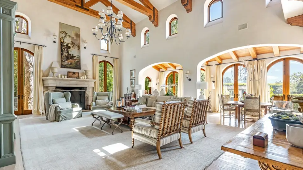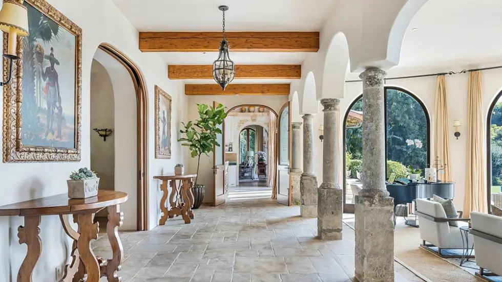 Meanwhile, both the first and second floors boast gorgeous glass doors and soaring ceilings making them the perfect place to host family and friends. But upon entry alone, the Leonard Estate welcomes you to the sight of exposed wood beam ceilings, ornate tile flooring, and ocean and mountain views through ample windows.