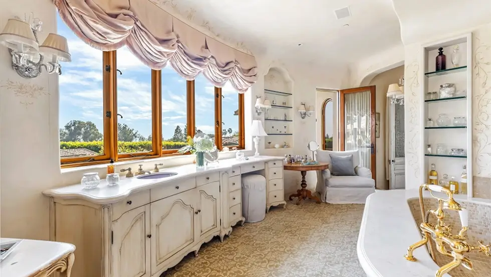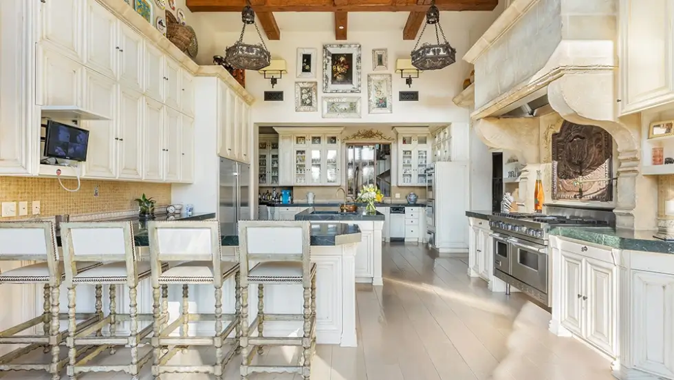 This three-story property boasts an expansive real estate of 16,773 square feet. It even has a guest house. The manse itself has eight bedrooms and 15 bathrooms, a chef’s kitchen with upscale appliances and custom cabinetry, and marble countertops. A winding staircase connects the formal dining room and multiple lounge areas.