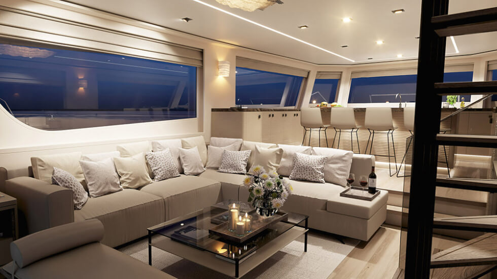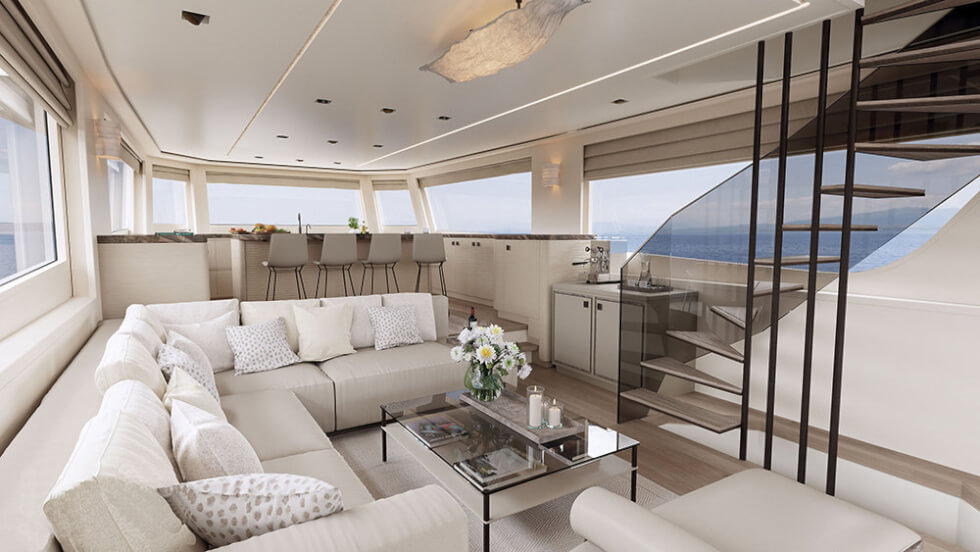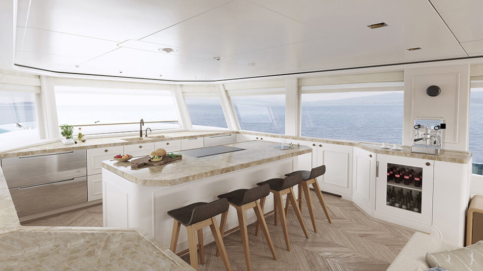 Designed with the outdoor lifestyle in mind, the LeVen 90 boasts a nearly 40-foot-long sundeck, with expansive bow seating, plus a huge rear Opacmare Transformer swim deck for launching kayaks or jet skis. You also get full-width doors that open up the main salon to the rear lanai deck, which Silva calls The Great Room. And instead of the forward end of the cabin transforming into a helm station, Silva uses it as an open space, full-width eat-in galley. With huge central island and bar stools, to boot.