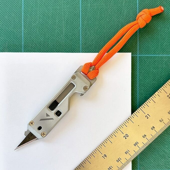 As for the blade, the Lever Gear Edge XT comes with a locking thumb slider to allow for one-handed operation when deploying or retracting the blade. The lock prevents the blade from accidentally sliding out even when not in use. Using the replaceable #11 utility blade is also a functional choice as it can easily cut rope or rip through cardboard and provides extra precision and tight turns with its narrow point.