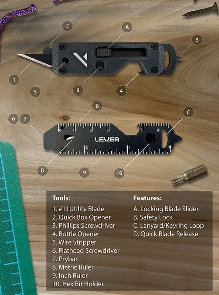 The Lever Gear Edge XT comes with a slim and lightweight profile yet large enough for a comfortable grip so you can work on those tasks with ease. Its size and shape form a natural handle with the prybar, screwdrivers (Phillips and Flathead), #11 utility blade, and box opener at either end.