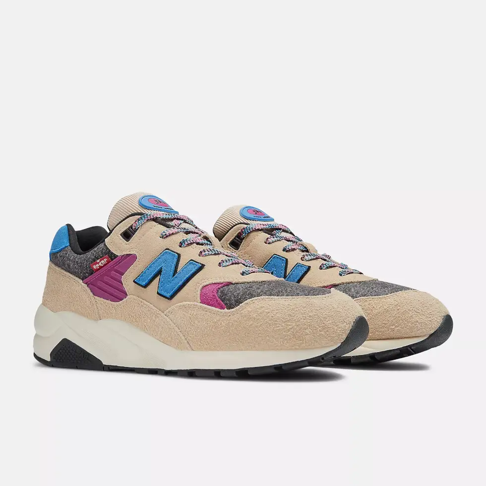 The Levi’s x New Balance MT580 are unisex sneakers available in earthy tones of beige/black/blue (MT580LE2) or a slightly muted dark gray/blue/black (MT580LV2) option. Both tout a sporty silhouette ideal for casual strolls in the city, a quick ride on your mountain bike, or maybe a moderate trip outdoors.
