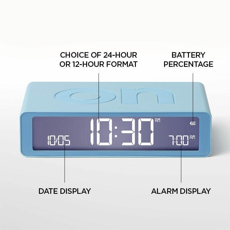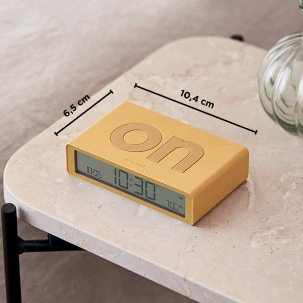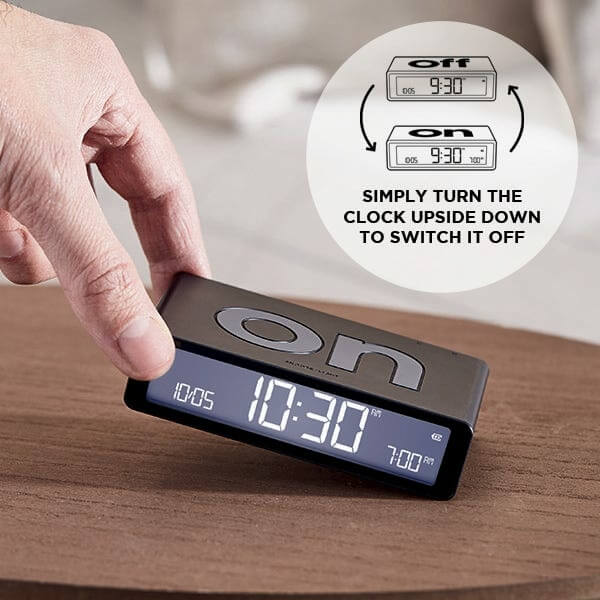 These include the discreet buttons on its back to set the time/date format, alarm, and screen brightness and the large ON and OFF faces equipped with a touch sensor that lights up the screen. To activate the alarm, the clock must be flipped to the ON side and then on the OFF side to deactivate it.