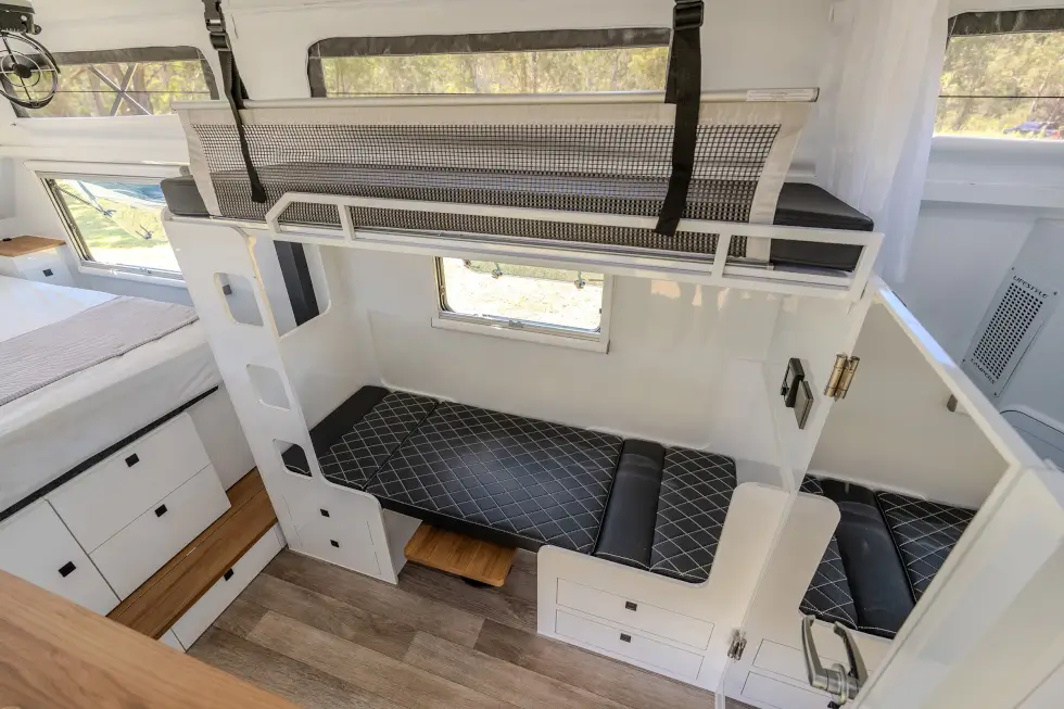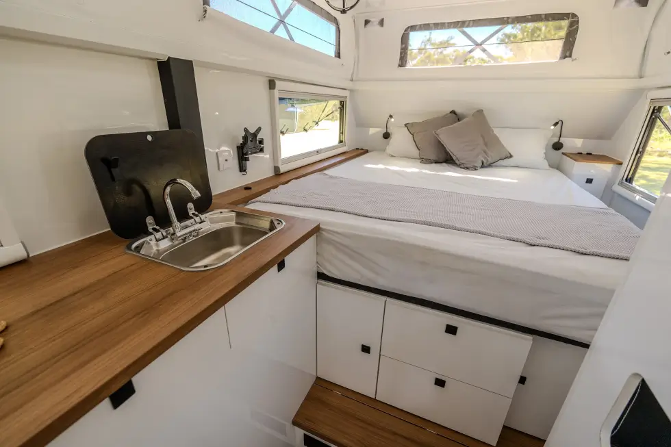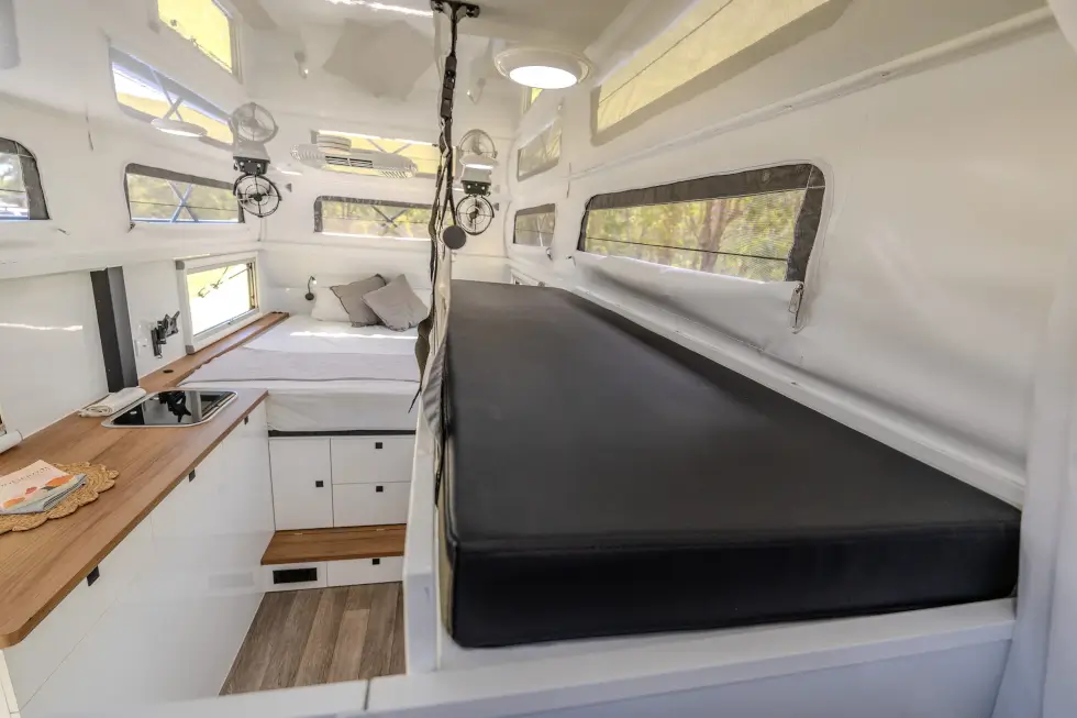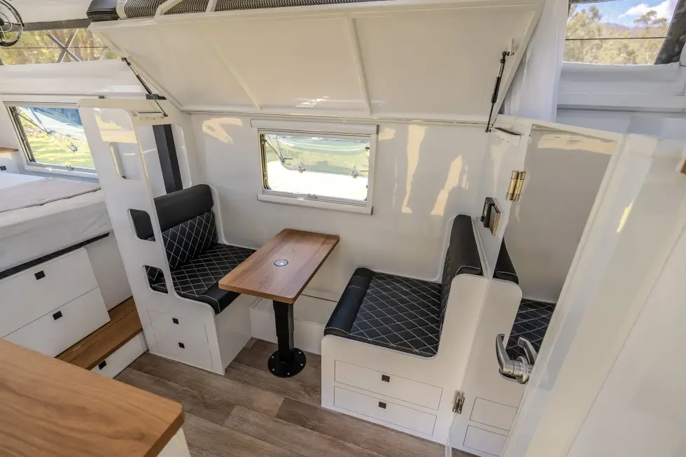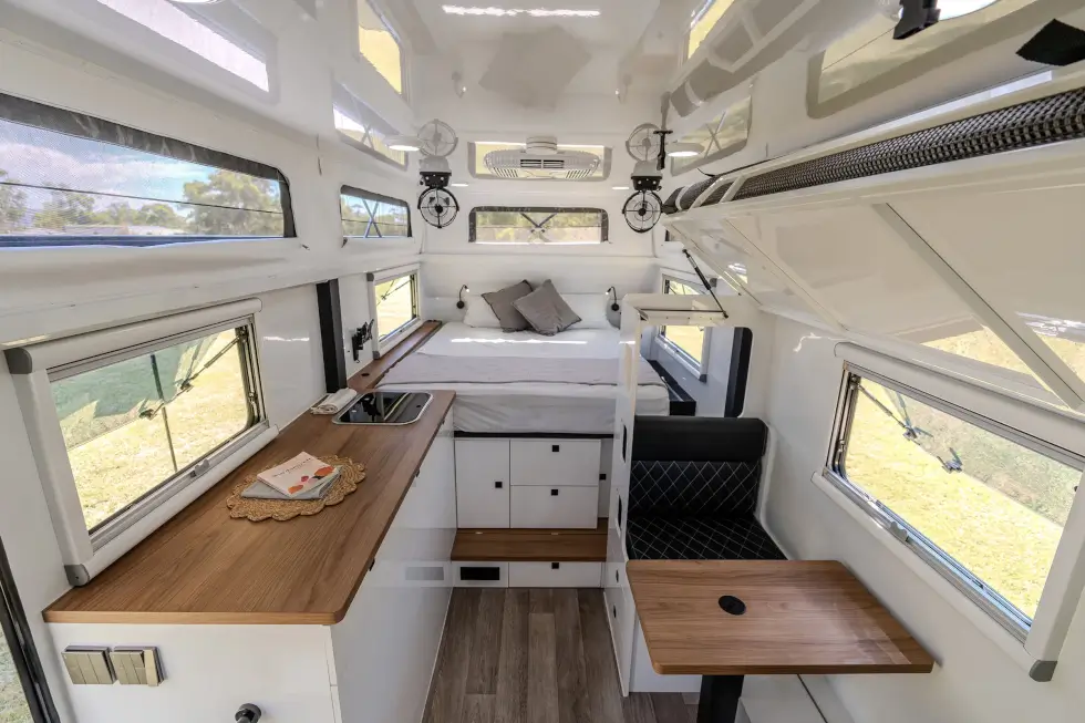 The manufacturer notes that each unit “takes innovation to an entirely new level. Compact yet spacious, and sleeping up to five people in total comfort, it’s the ultimate Hypercamper for adventurers who refuse to compromise.” You get to choose from four layout options, and each accommodates anywhere between two to five people.