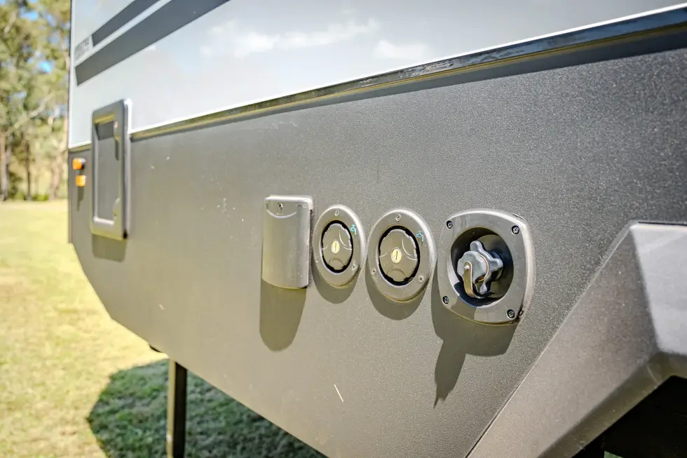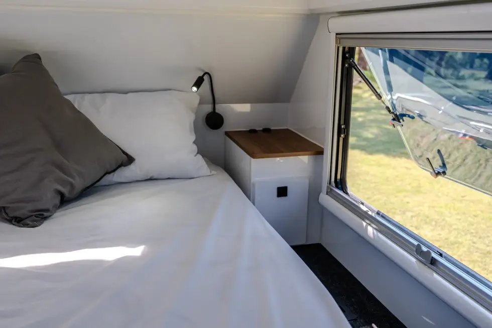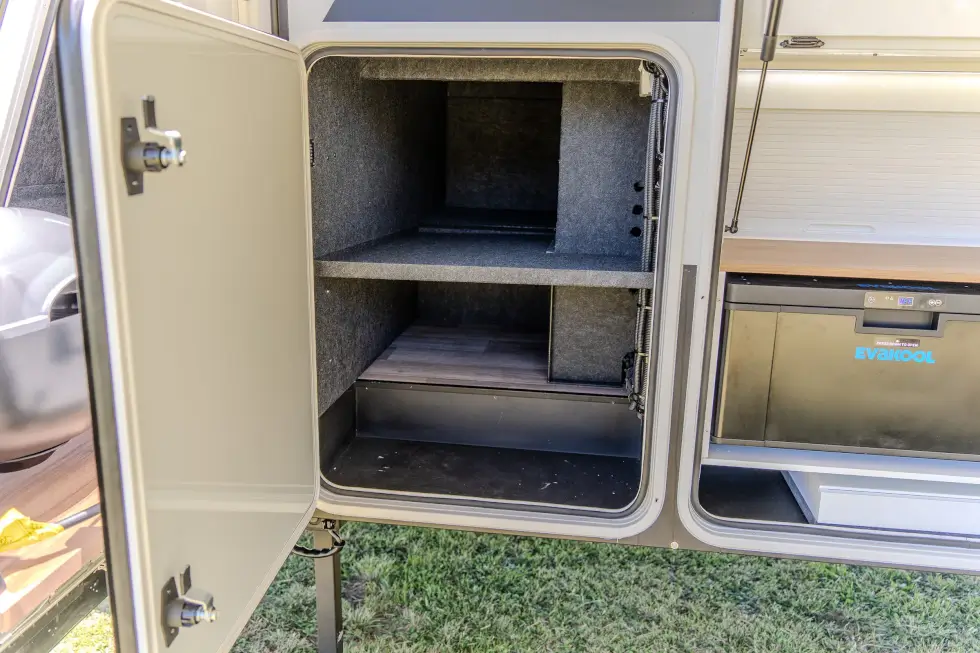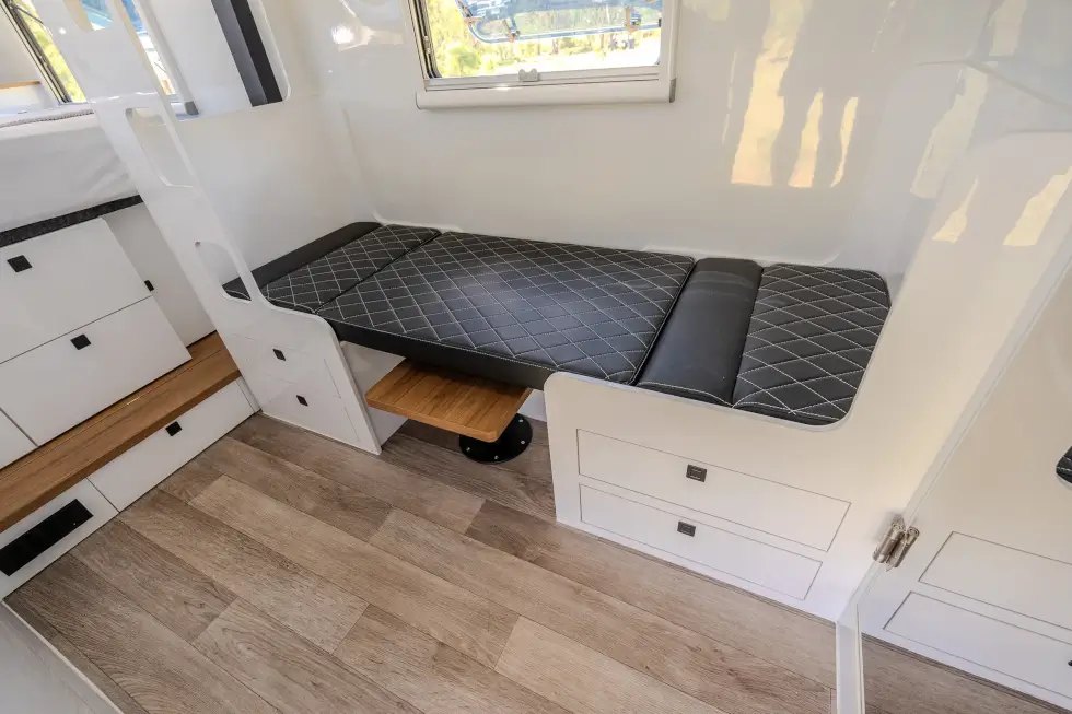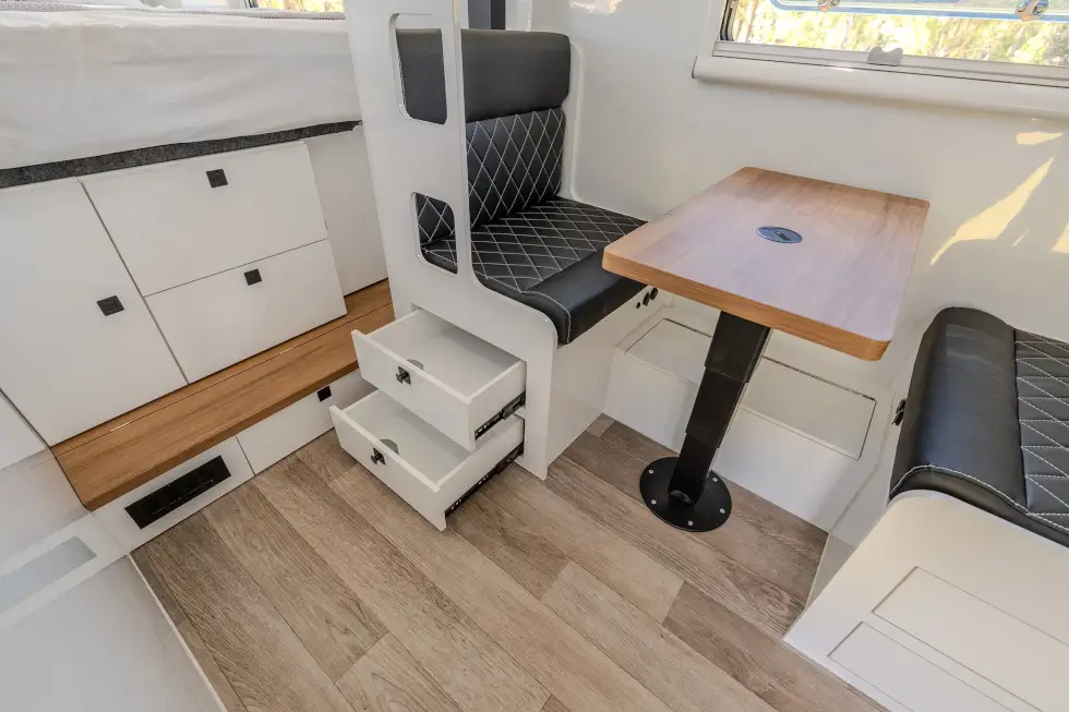 To maximize space for creature comforts and amenities, go for the Café Dinette setup. On the other end of the spectrum, the Triple Bunk configuration easily sleeps up to five. Notable conveniences include the motorized roof lifting and lowering mechanism, four drop-down stabilizer legs, and a wind-out awning.