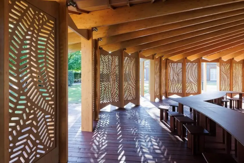 Then CNC-machined wooden screens adorned with leaf-like perforations partially serve as walls while still allowing views and ventilation. The “À Table” features a suspended wooden floor mounted on a precast concrete pad foundation that will be removed and rebuilt at a different site after it closes on 29 October 2023.