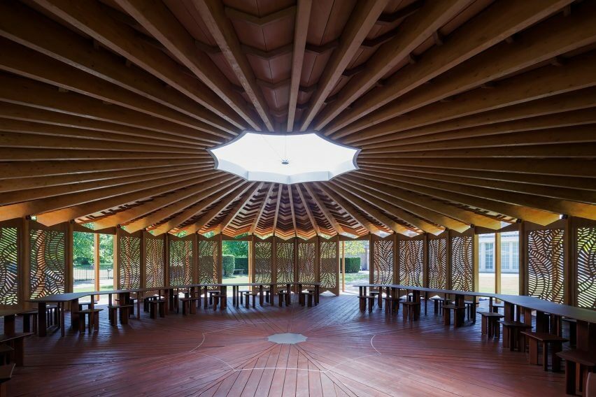 As such, the pavilion aims to be a gathering place where people can meet and communicate with each other. It is a nine-sided structure that encloses a trio of scalloped-shaped tables. Ghotmeh said her design encourages people to “dwell together in the same space and around the same table. It is an encouragement to enter into a dialogue, to convene and to think about how we could reinstate and re-establish our relationship to nature and to Earth.”