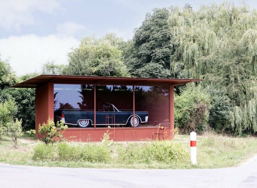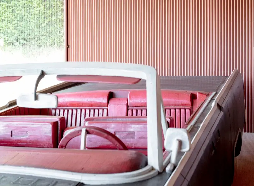 Since he just can’t just display it directly without any form of shelter against the elements, Ronan Bouroullec and Erwan Bouroullec came up with a solution. The exhibit’s location will be at a roadside close to a small village. Because the attraction is the wooden replica of a classic car, the duo opts for a modest plan.