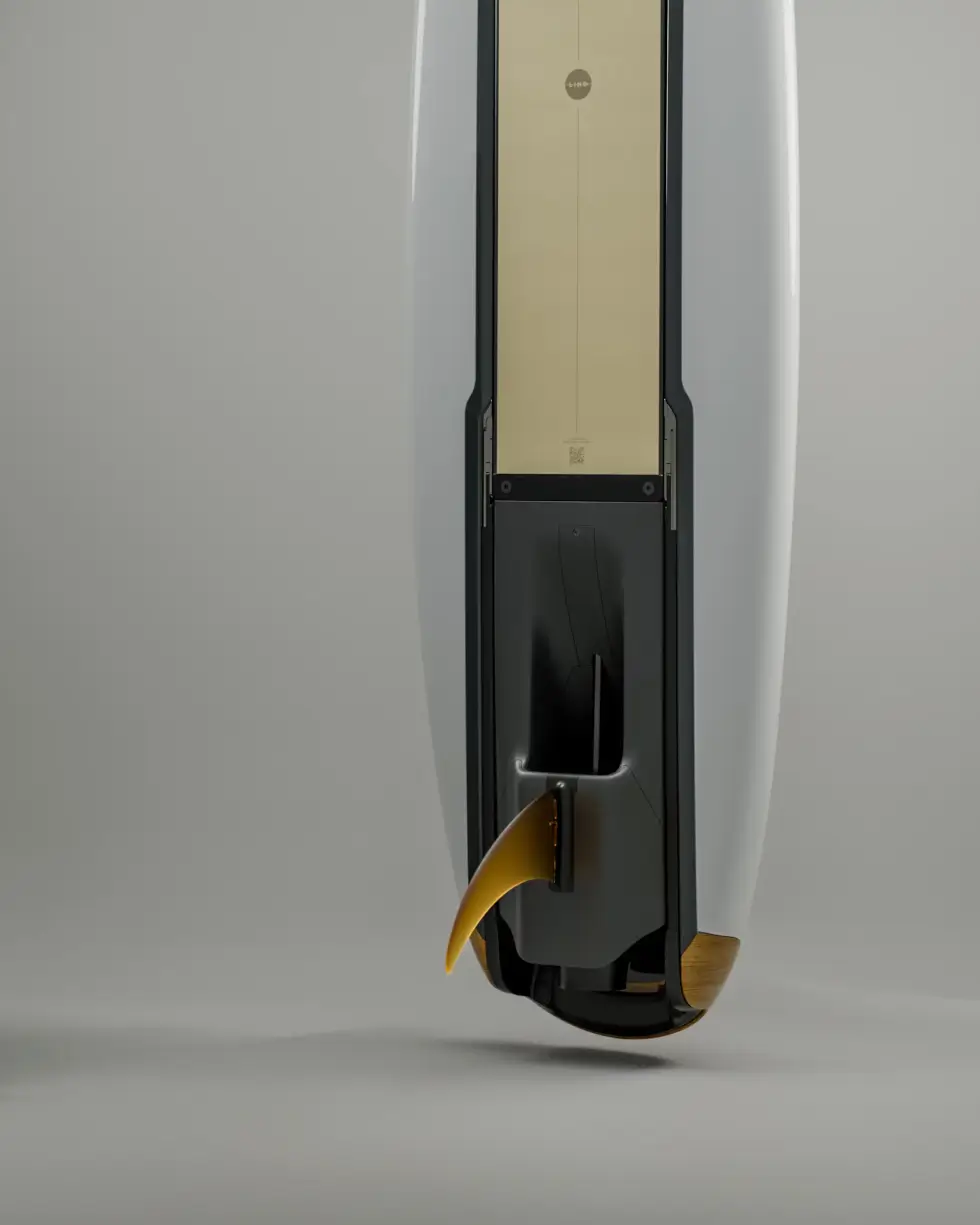 Other items included in the package are a board bag, find, charger, remote lanyard, deck pad, and more. The mid-length variant measures 6’9″ × 23″ × 6″ at 88 liters, while the shortboard is 6’3″ × 21″ × 6” at 66 liters. Power comes from the 3.1 kWh custom battery. It is fully waterproof and installed below the surfboard to aid with cooling.