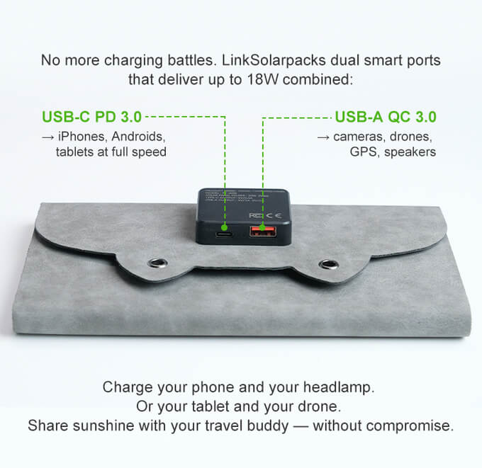 When recharging, simply unfold and in less then three seconds, you’re harnessing the sun’s power. LinkSolar offers dual ports for efficiency including a USB-C and USB-A for a combined 18W fast charge. It can power virtually anything USB including headlamps, laptaps, cameras, phones, flashlights, drones, and more.