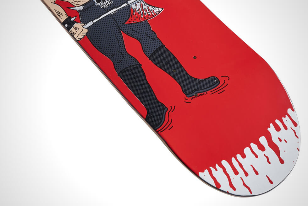 The bottom of the skateboards sport hardcore artwork which is screen-printed by hand. You can see the graphics set on a vibrant red background infused with Tony Hawk’s DNA. On top of the image is a line of text that reads “Murder Your Thirds Just Like Tony Hawk!” In a stylish font.
