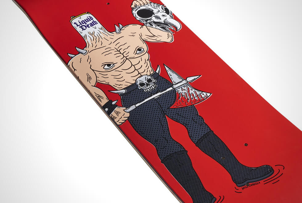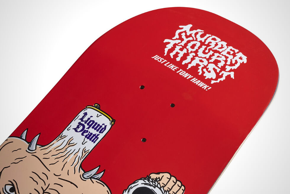 Many might find Liquid Death’s Hawk Blood Deck partnership with the Birdman somewhat strange. Nonetheless, 10% of the proceeds from sales will go to nonprofit groups 5 Gyres and The Skatepark Project. The former fights for the end of plastic pollution in our oceans, while the latter aims to finance public skateparks in low-income communities.