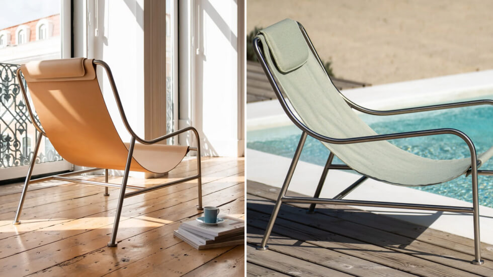 Hence, the birth of the Lisboa Sling Chair, a lightweight lounge chair that adapts to the user’s living conditions. It features a robust and stable organically-formed stainless steel frame, available in both brushed and polished finishes, with the option of either a weather-resistant fabric or natural premium leather seat, making it suitable for both indoor and outdoor use.