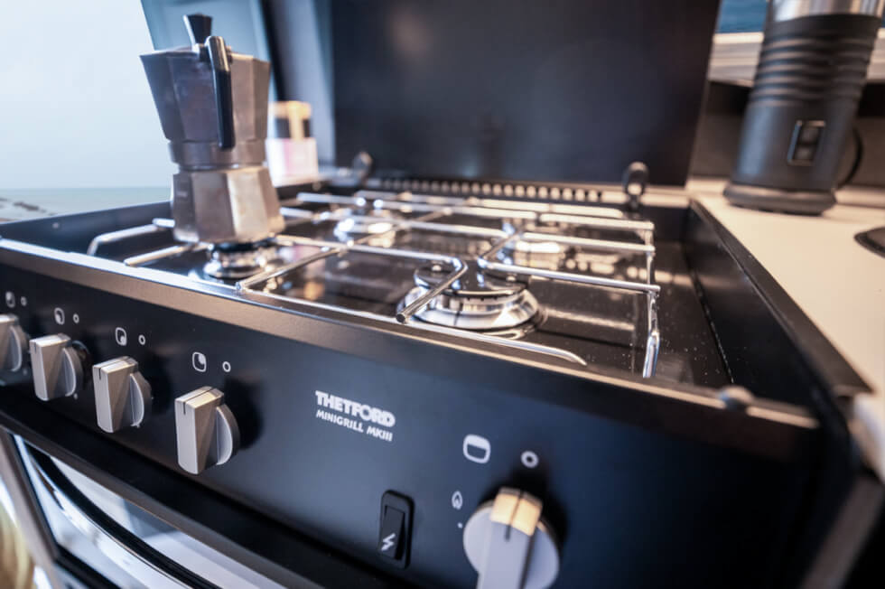 Meanwhile, the front hosts a five-seat dining area with an L-shaped bench and another convertible table. This space transforms into a sleeping nook for children. Then on the center is a fully-furnished kitchenette with a four-burner gas stove and oven, a refrigerator and freezer, and a matte black sink.
