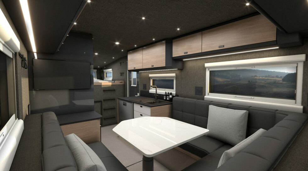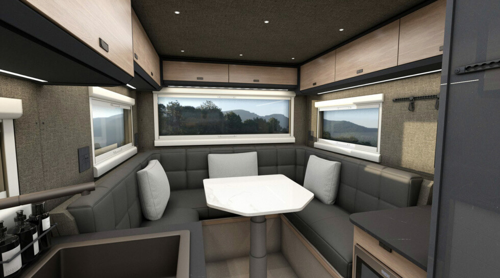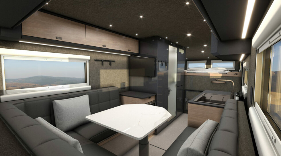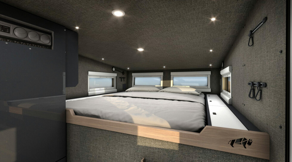 Outfitted with a solar power system for up to 1,420W of clean energy which it can store in a 900 Ah lithium battery bank, the Falcon X supplies its electronics via a 4,000W inverter/charger setup. The camper can comfortably sleep up to six people. The vehicle pass-through makes it easy to access its spaces for driving or leisure.