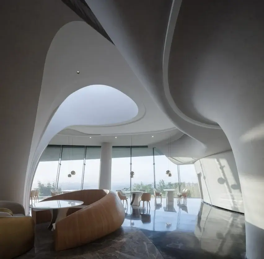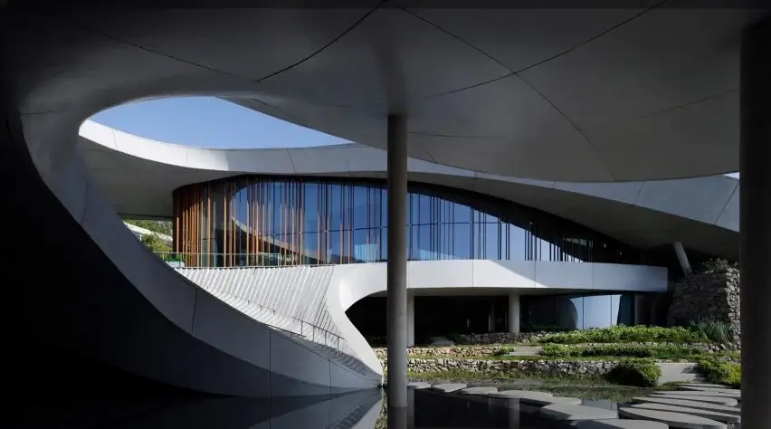 The 4,200 square-meter building made from GRC concrete panels boasts such a strong character with its undulating forms that are connected at various heights. It resembles a “spaceship or alien form” ready to launch when viewed from certain angles. At the same time, according to Büro Ziyu Zhuang, it is “subdued enough that it does not threaten or contradict the existing natural environment, like a fold in the ground or a flying bridge in the forest, hidden from view.”