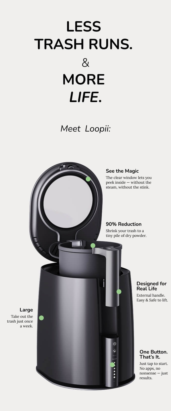 Food scraps and other kitchen waste not only leave a nasty smell but also attract bugs and worms if left to rot for days in the trash. Regular home composting helps, but the process is painfully slow. It takes roughly six months to a year to see results. Hence, TRhino created the Loopii food recycler, an efficient and eco-friendly device that turns waste into valuable resources.