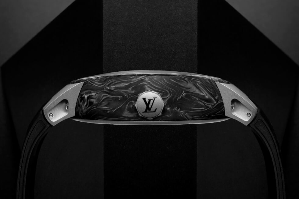 Aside from the brand’s distinction, each Tambour Curve Flying Tourbillon is a bespoke example of its own. This is courtesy of the 46 mm case which is apparently CarboStratum. It is an unbelievably lightweight yet durable material from 100 sheets of carbon layered and compressed. This results in unique patterns which means that no two watches are the same.