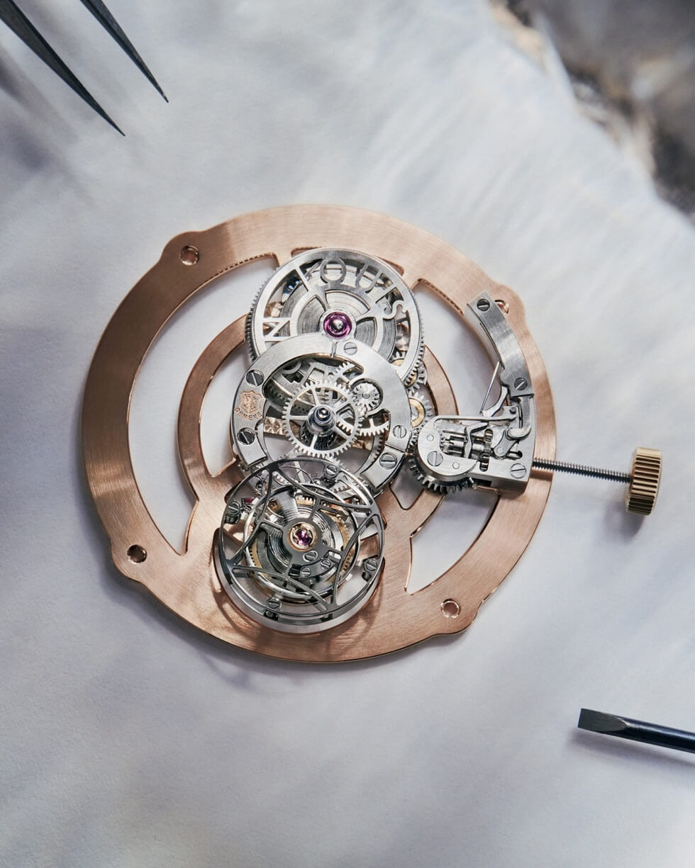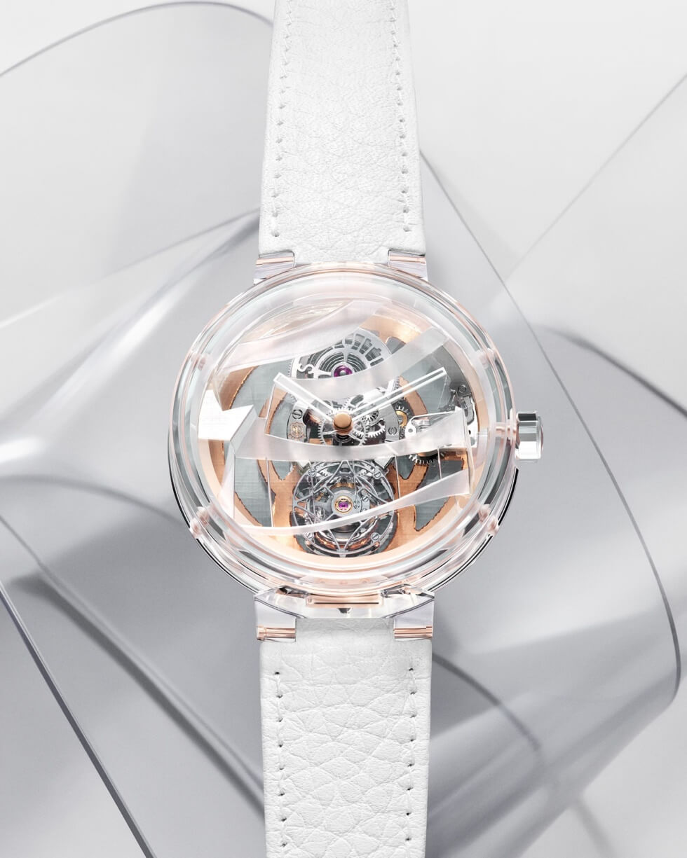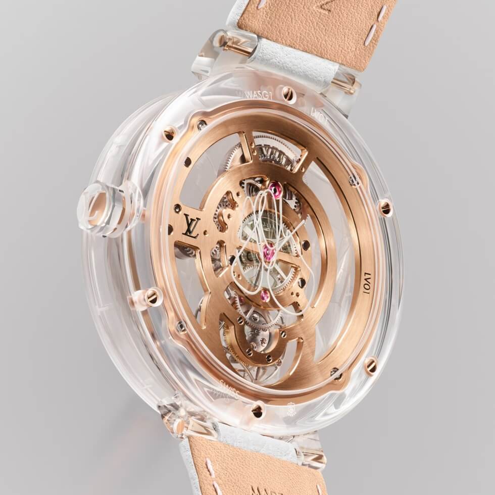 The complication completes a rotation in one minute and doubles as a counter for the seconds. Louis Vuitton details that it’s comprised of 160 components and 17 jewels. Its frequency is listed at 21,600 vph or 3 Hz with a power reserve of 80 hours when fully wound.
