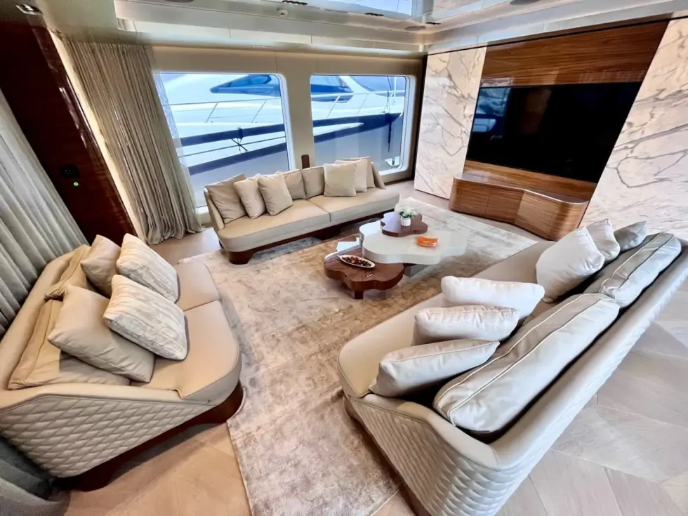 There is no question that everything about the Lucy just screams luxury. There’s a full-beam owner’s suite with a lounge, a VIP cabin, and a guest cabin. The crew and the captain also have their accommodations at the bow. Head up to the flybridge and take a dip in the infinity pool or jacuzzi.