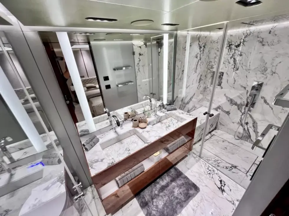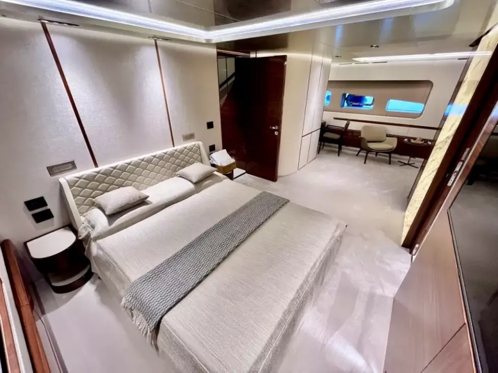 The company points out that the 120-foot superyacht is based on the EVO 120 series from Tecnomar. Moreover, this is the Italian shipyard’s fourth delivery of its high-class tri-decker. According to the listing, the original launch was in May.