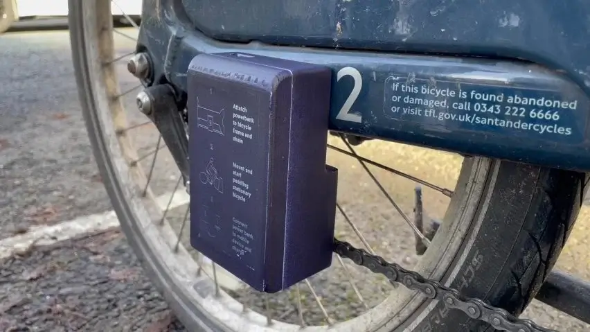 The Central Saint Martins graduate created a working prototype with a 3D-printed shell and in a navy blue finish to blend in with the Santander bikes and with instructions printed in UV ink so they are visible in the dark. This portable charger features a small gear at the back designed to slot onto the chain of the bike. Talbot took advantage of the fact that even without paying to take one bike out of its parked state, the chain still moves when pedalled backwards.
